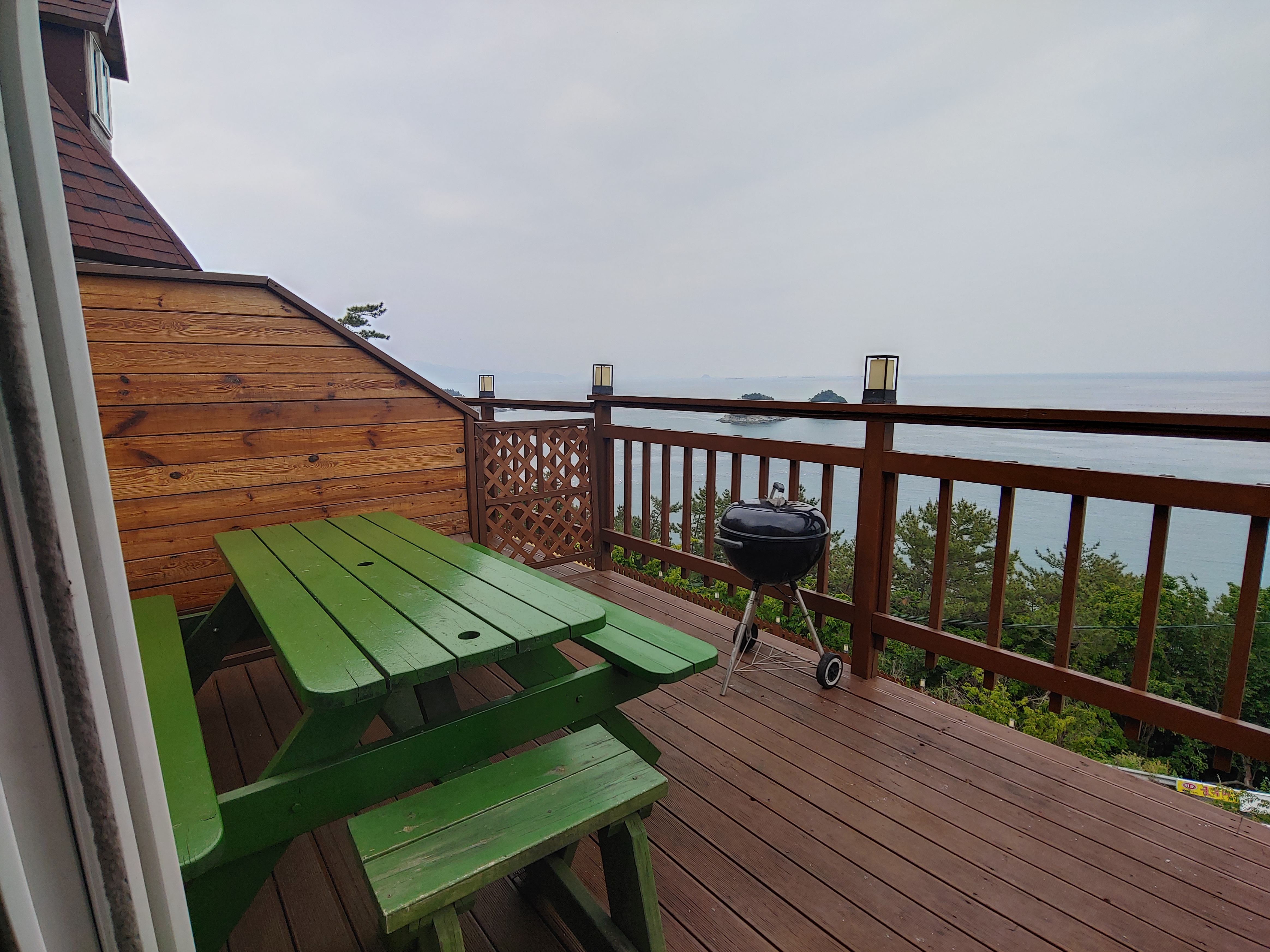 필란드의 아침 102호의 장점은 주방문을 열고 나가면 테라스로 꾸며진 바다뷰 바베큐장이 있다는거에요