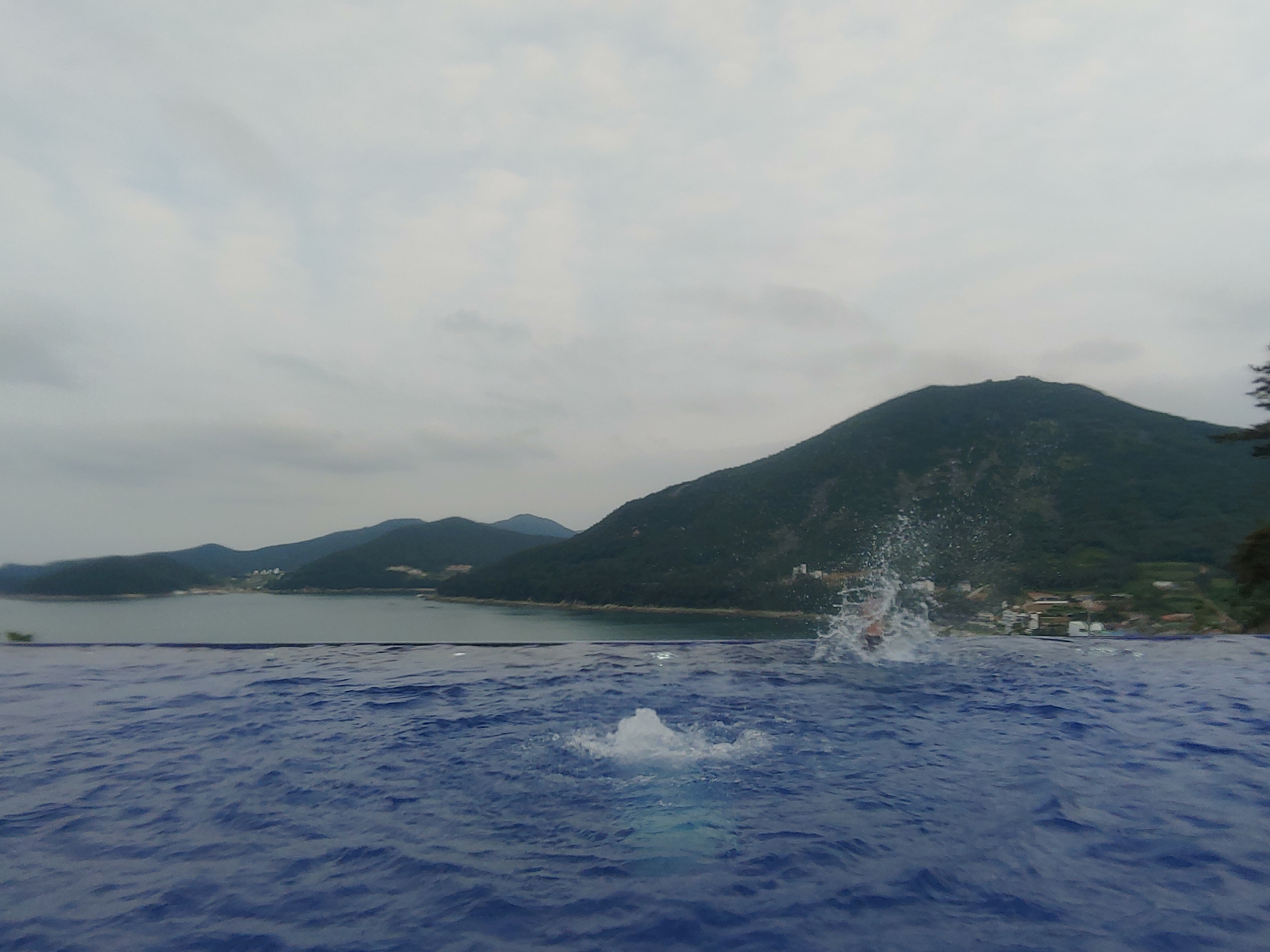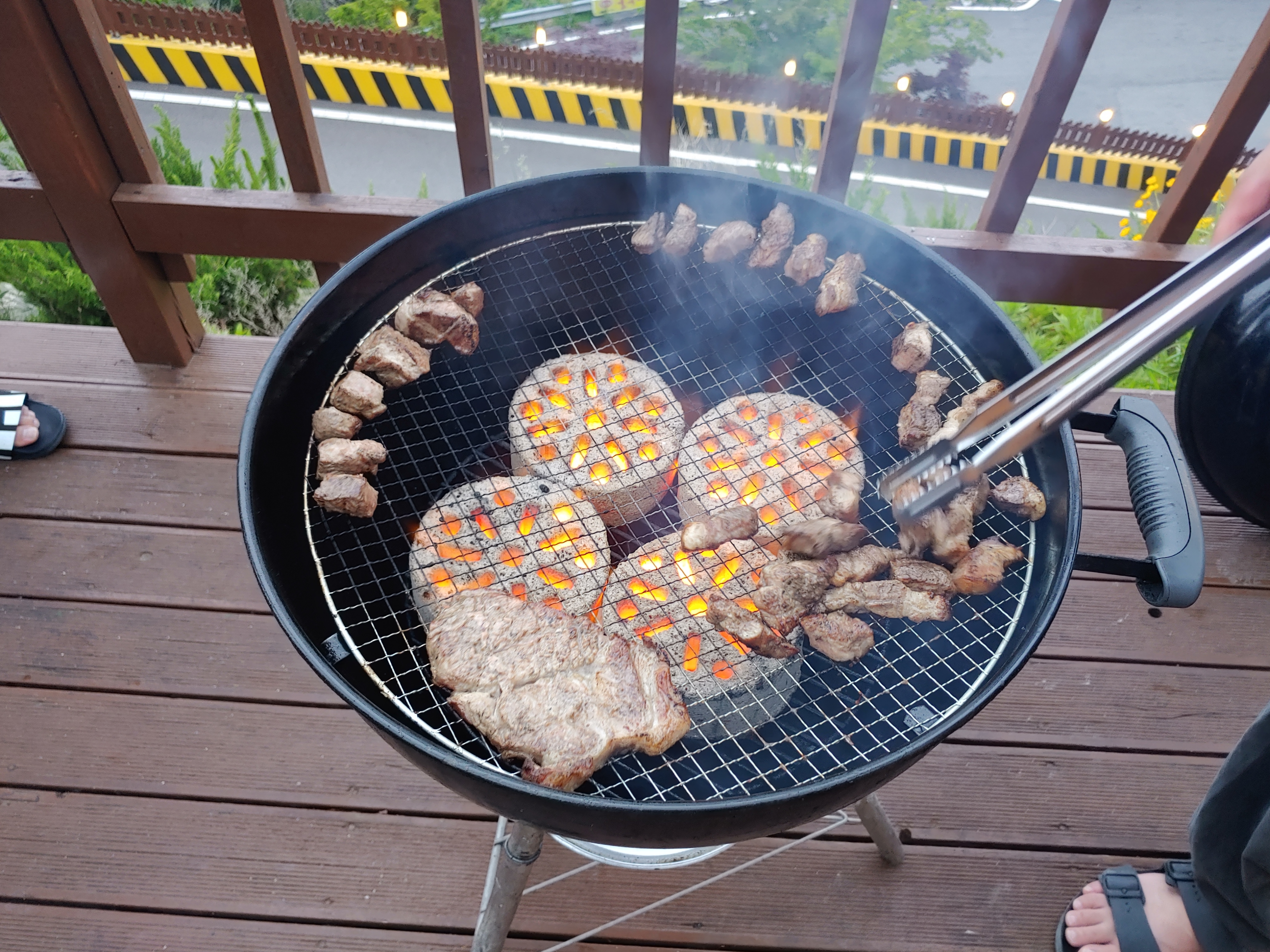 수영장에 한번 들어가면 수영장에서만 있는게 아니라 펜션 왔다갔다 할 수 있어서 수영하다 배고프다 싶을때 숯불 주문하고 바다뷰보며 고기먹고 다시 수영할 수 있어요