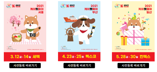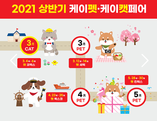 2021년 상반기 3월에 캣페어와 3,4,5월에 펫페어가 서울, 부산, 일산에서 열리고 하반기엔 6월 캣페어 8,9,11월에 펫페어가 서울, 수원,일상에서 열려요