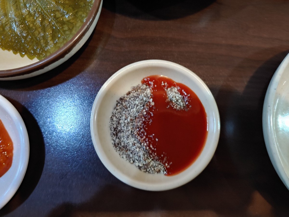 들깨초장 소스인데요 고소한 들깨와 초고추장 같은 고추장 소스가 고소하면서 느끼함을 잡아주고 오리불고기하고 잘 어울려요