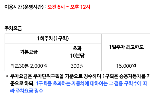 주차요금 최초30분 2,000원 / 추가 10분당 300원 / 일일주차 15,000원이에요