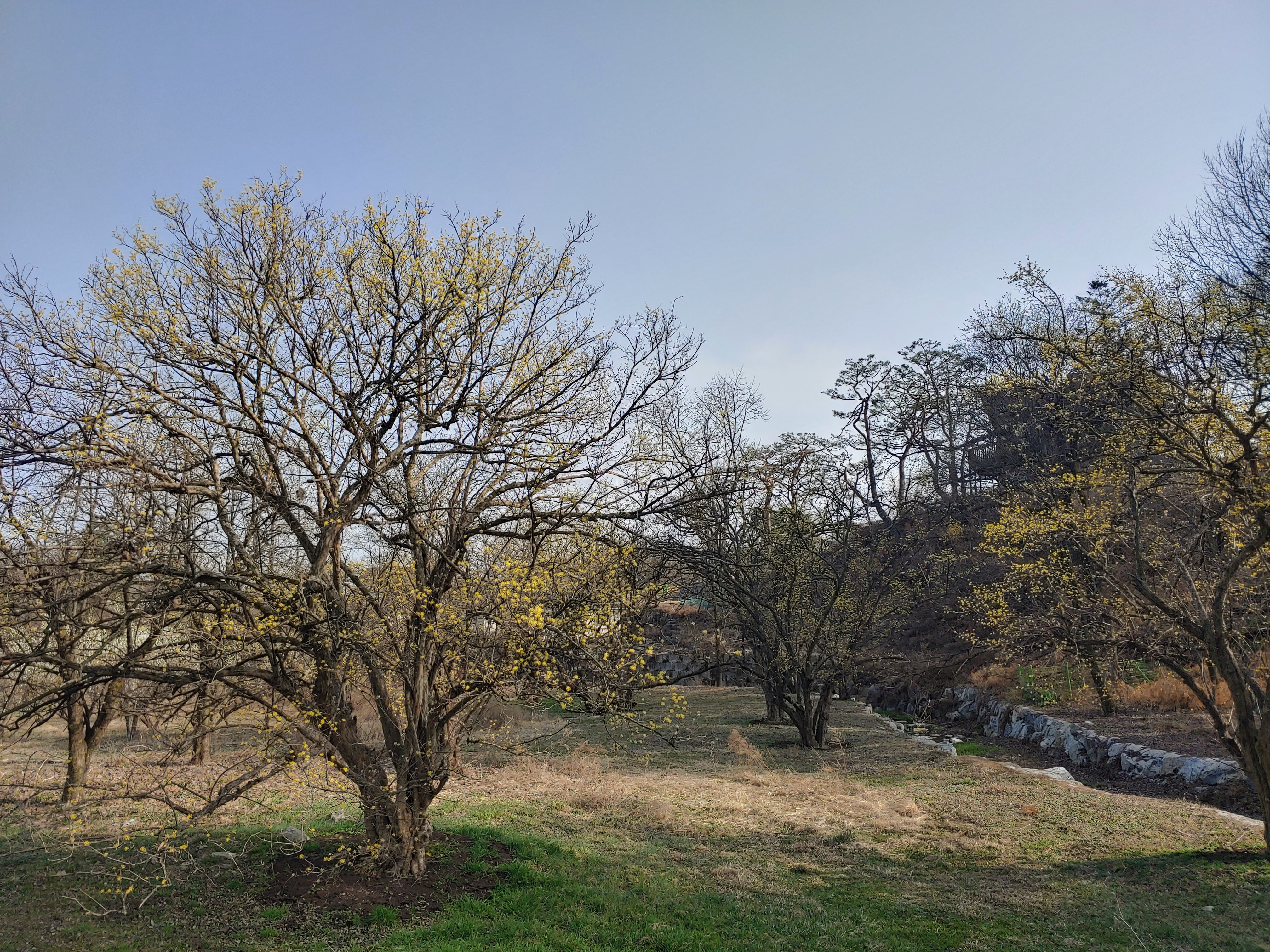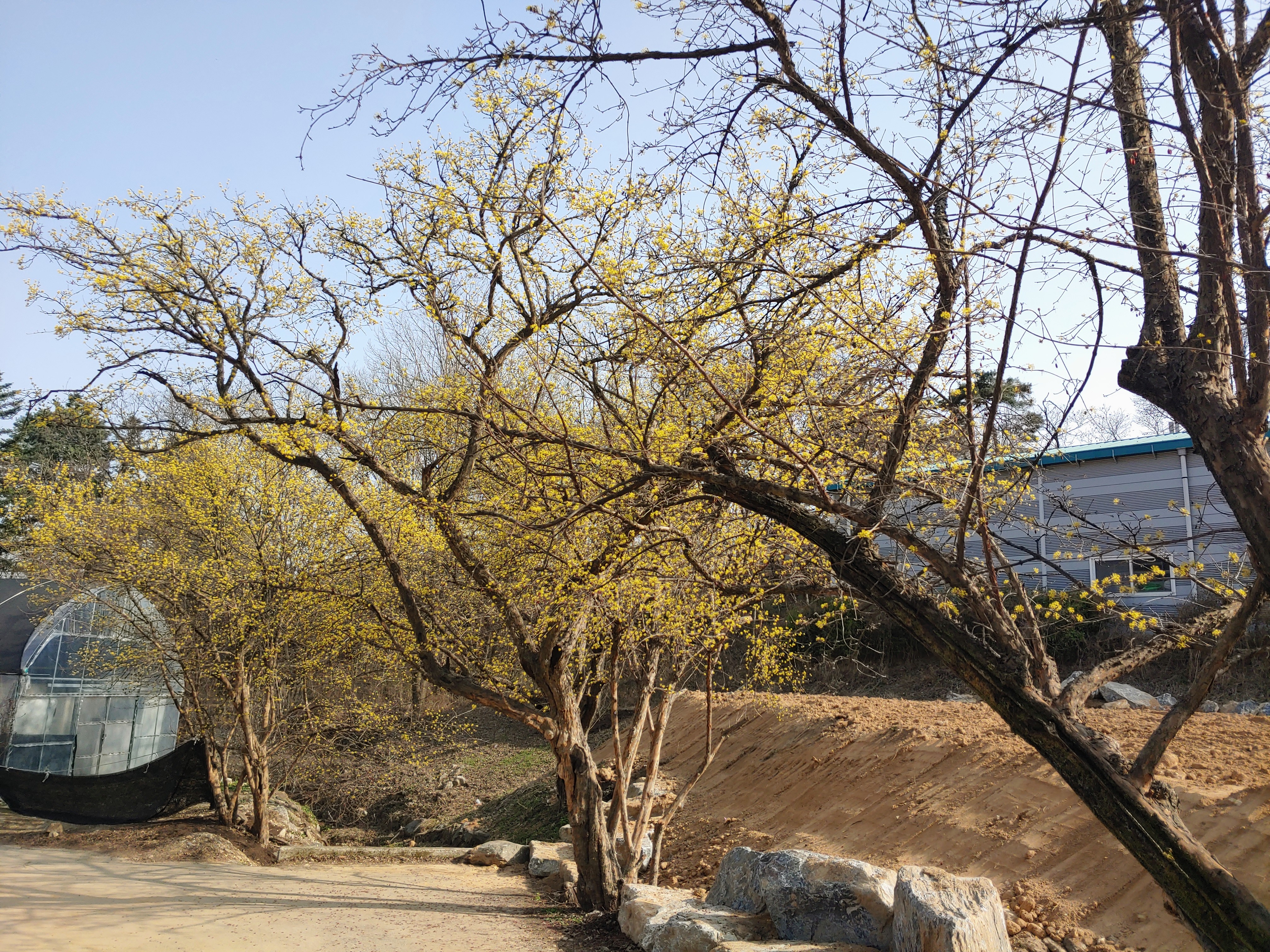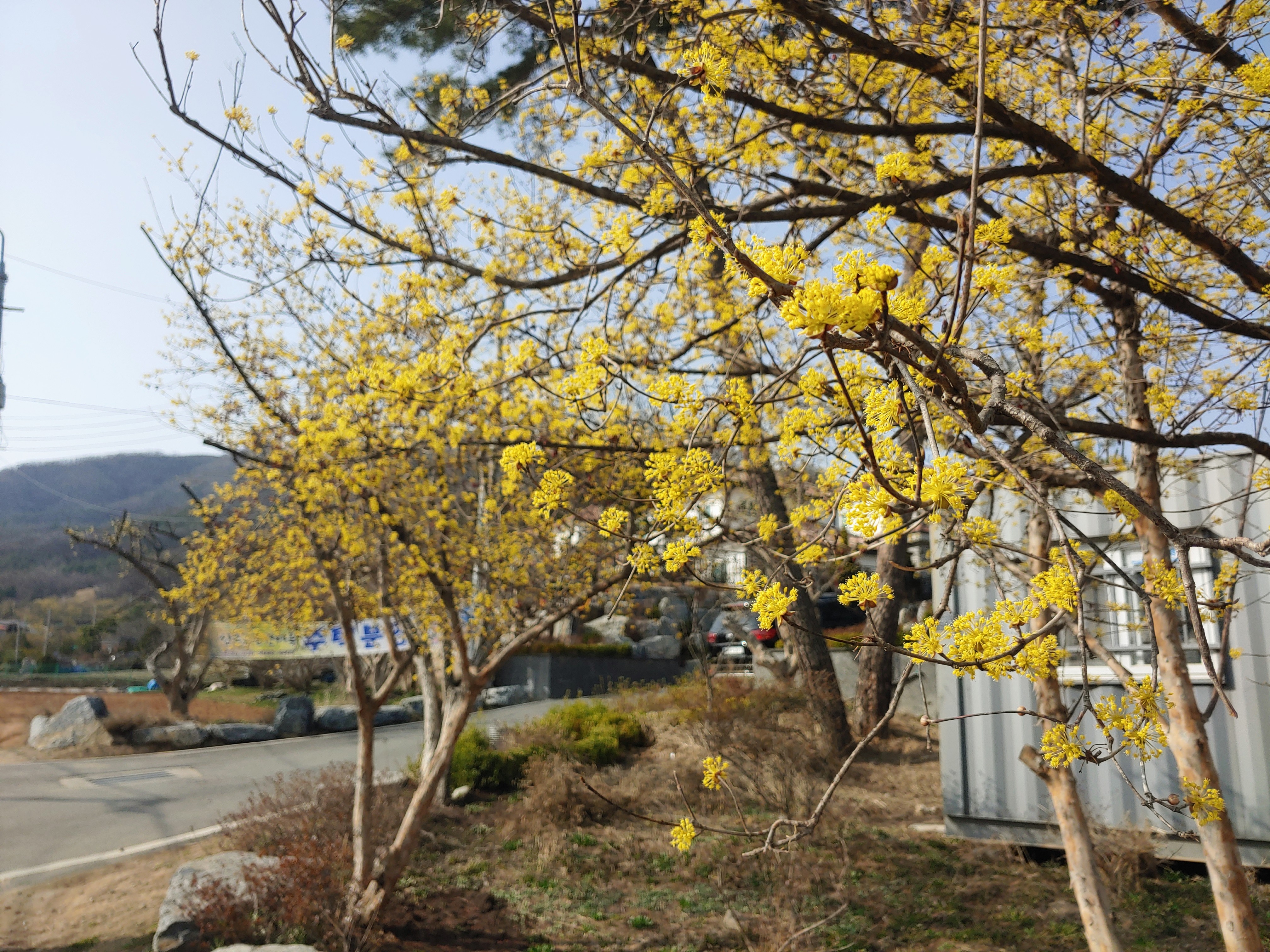 이천 산수유마을 입구쪽에있는 멋스러운 산수유사랑채의 뒷쪽에 정자와 아직 개화가 다 되지는 않았지만 노랗게 물든 산수유가 눈길을 끌어요