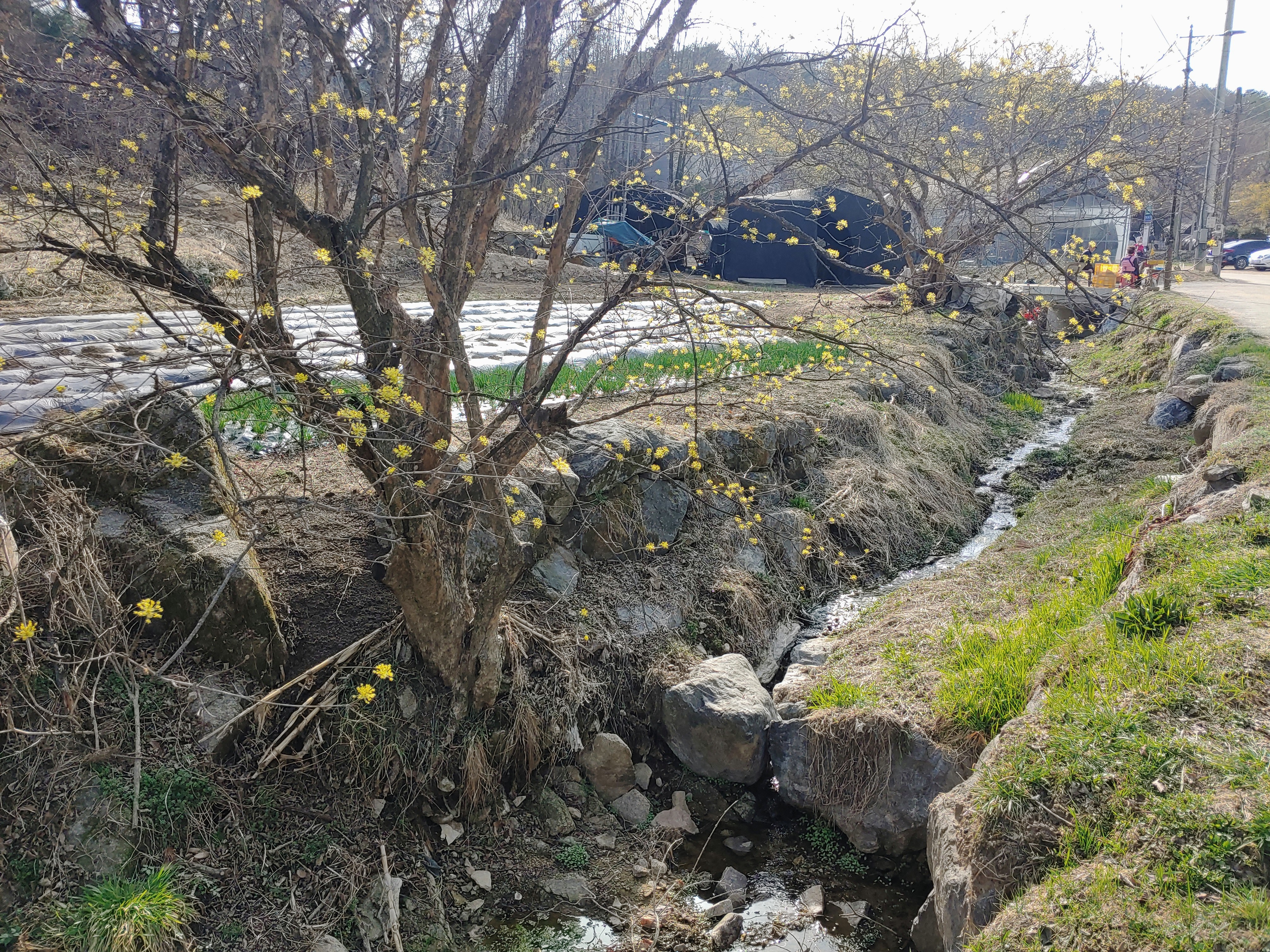 실개천 앞쪽에 활짝핀 산수유가 실개천과 환상의 궁합을 자랑해요