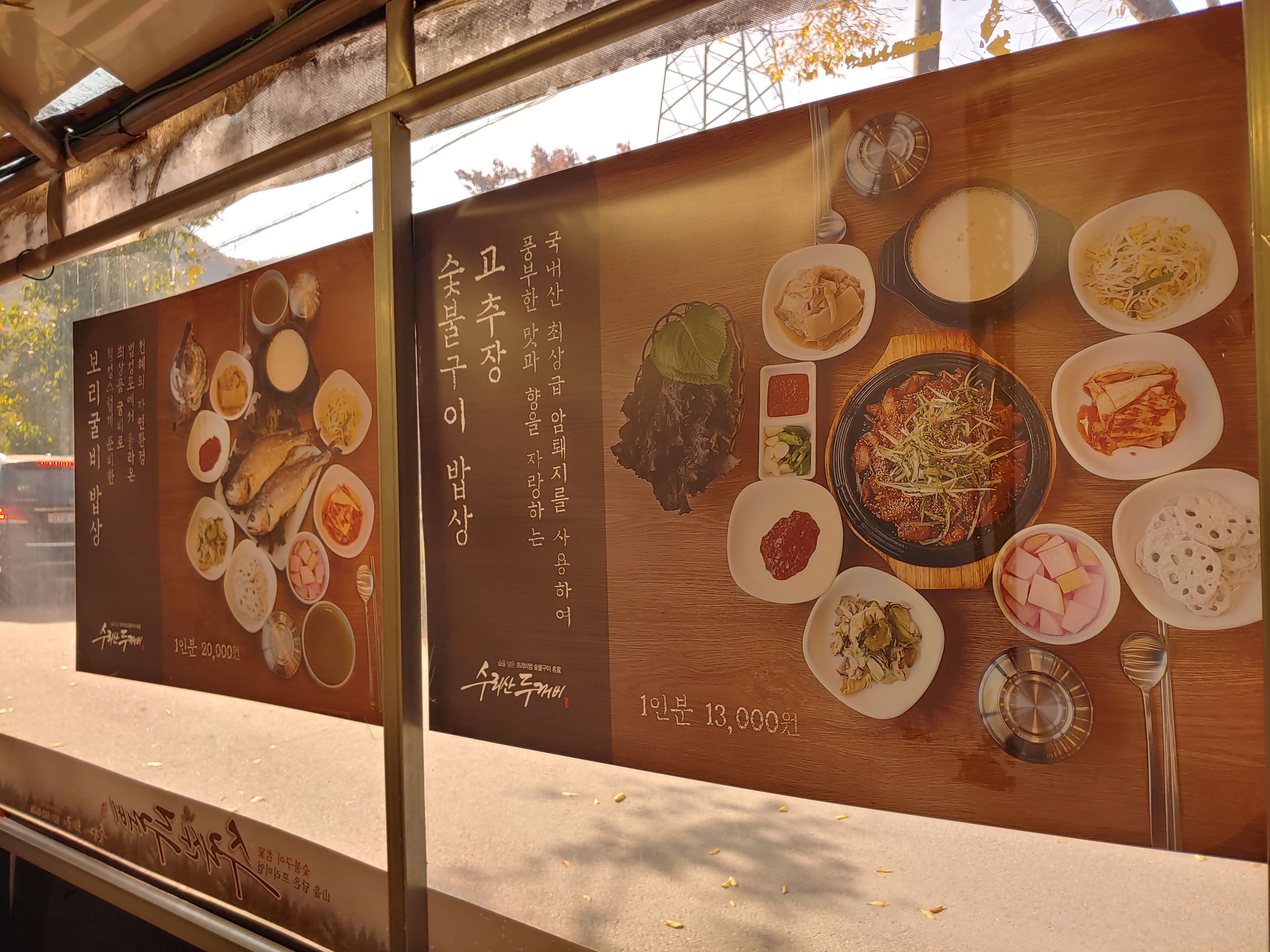 보리굴비 밥상은 1인분에 20,000원 고추장 숯불구이 밥상은 1인분에 13,000원이에요