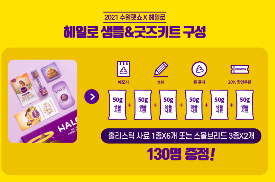헤일로 샘플&굿즈키트 구성은 헤일로 사료 샘플 홀리스틱 사료 1종 6개 또는 스몰브리드 3종 2개와 굿즈, 할인쿠폰으로 4월 16일부터 18일까지 경품지급처에서 sns 인증 확인 후 샘플키트를 수령할 수 있고 금요일 30명, 토요일 50명, 일요일 50명 총 130명으로 1인당 1키트만 수령이 가능하다고 해요