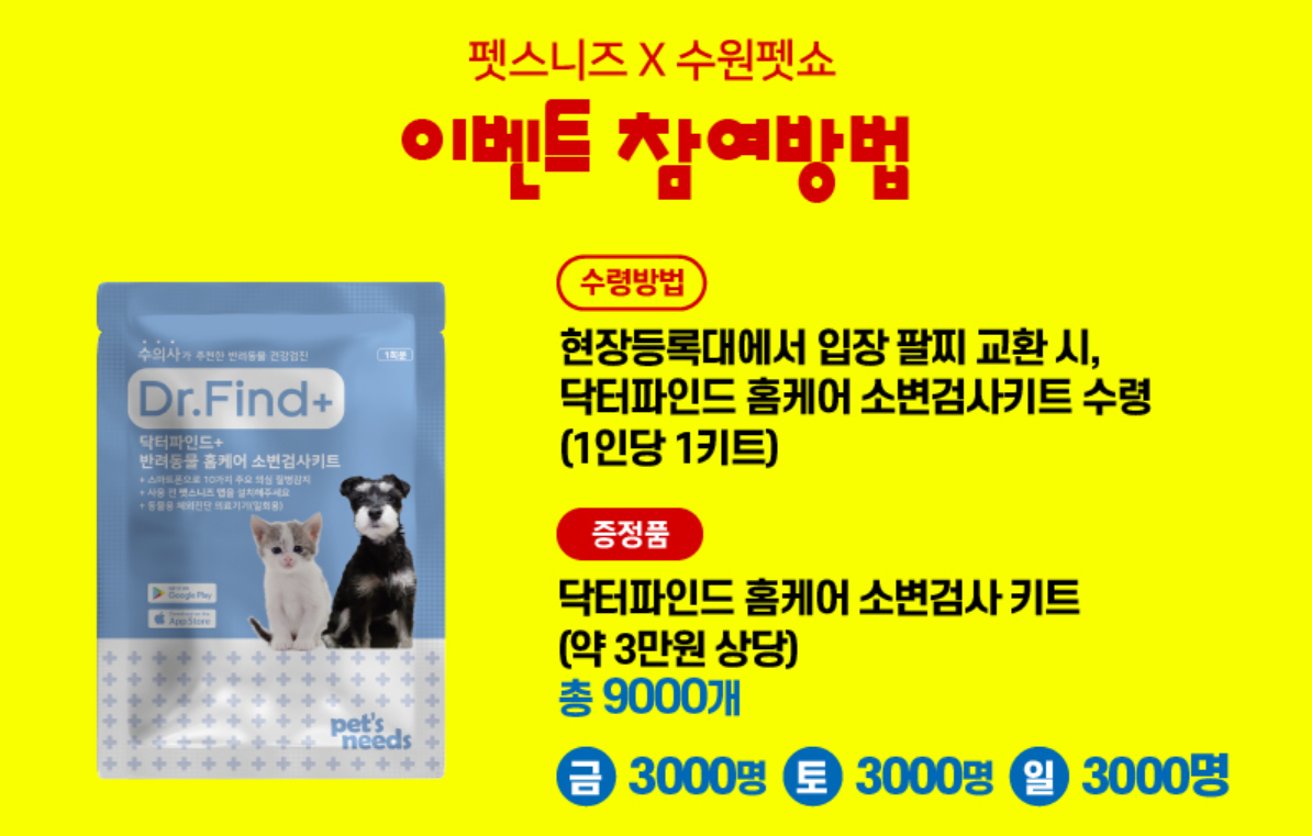 수원펫쇼에서 박람회 기간 중 펫스니즈와 함께 멍멍튼튼 캠페인을 진행한다고해요 펫스니즈는 반려동물 건강검진 헬스케어 솔루션을 제공하는 기업으로 병원 내원 없이 반려동물의 건강상태를 가정에서 손쉽게 체크하며 10가지 이상의 초기 질병을 예방 할 수 있도록 도와주는 닥터파인드 키트를 제공한다고해요