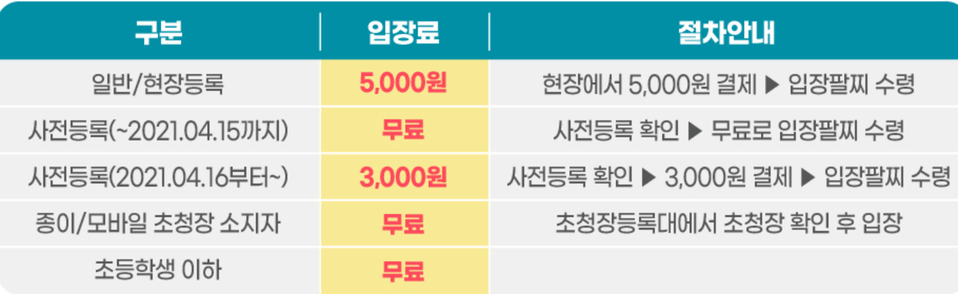 2021년 4월 16일부터 사전등록하면 3,000원에 관람이 가능하고 초등학생 이하는 무료 관람할 수 있어요
