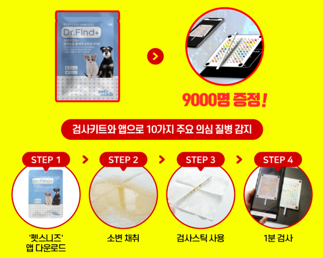 닥터파인드 키드 사용방법 펫스니즈 앱 다운로드하고 울 댕댕이들의 소변 채취해서 검사스틱 사용하면 1분 검사로 10가지 주요 의심 질병을 감지할 수 있다니 간단해서 유용하게 사용할 수 있는게 닥터파인드 홈케어 소변검사 키드 탐나는데요