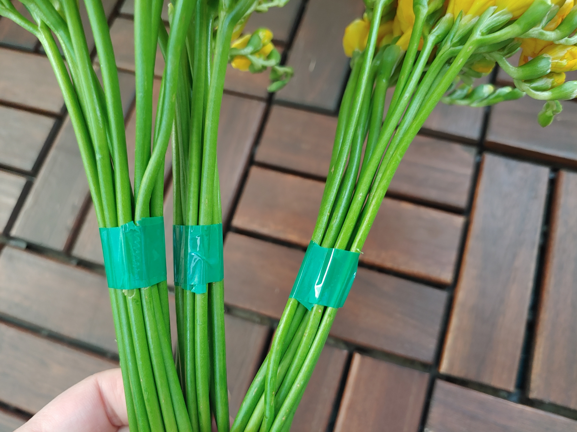 테이프 떼어내고 줄기 풀어주면 프리지아 꽃다발 조금 더 풍성한 느낌이에요