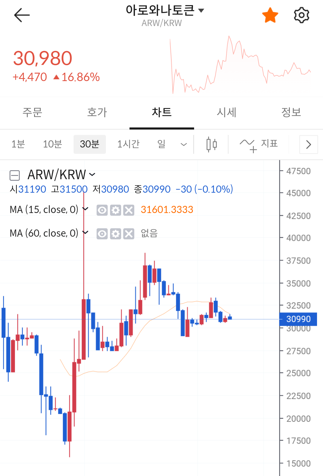 빗썸 코리아는 20일 자체 커뮤니티 사이트 빗썸 카페를 통해 아로와나 토큰의 원화 및 BTC 마켓 동시 상장을 발표했는데 빗썸에 20일 상장한 아로와나 토큰이 상장 30분만에 50원에서 5만 3800원 폭등했다며 상장한지 30분만에 1075배 치솟으며 시장의 관심을 받고 있습니다