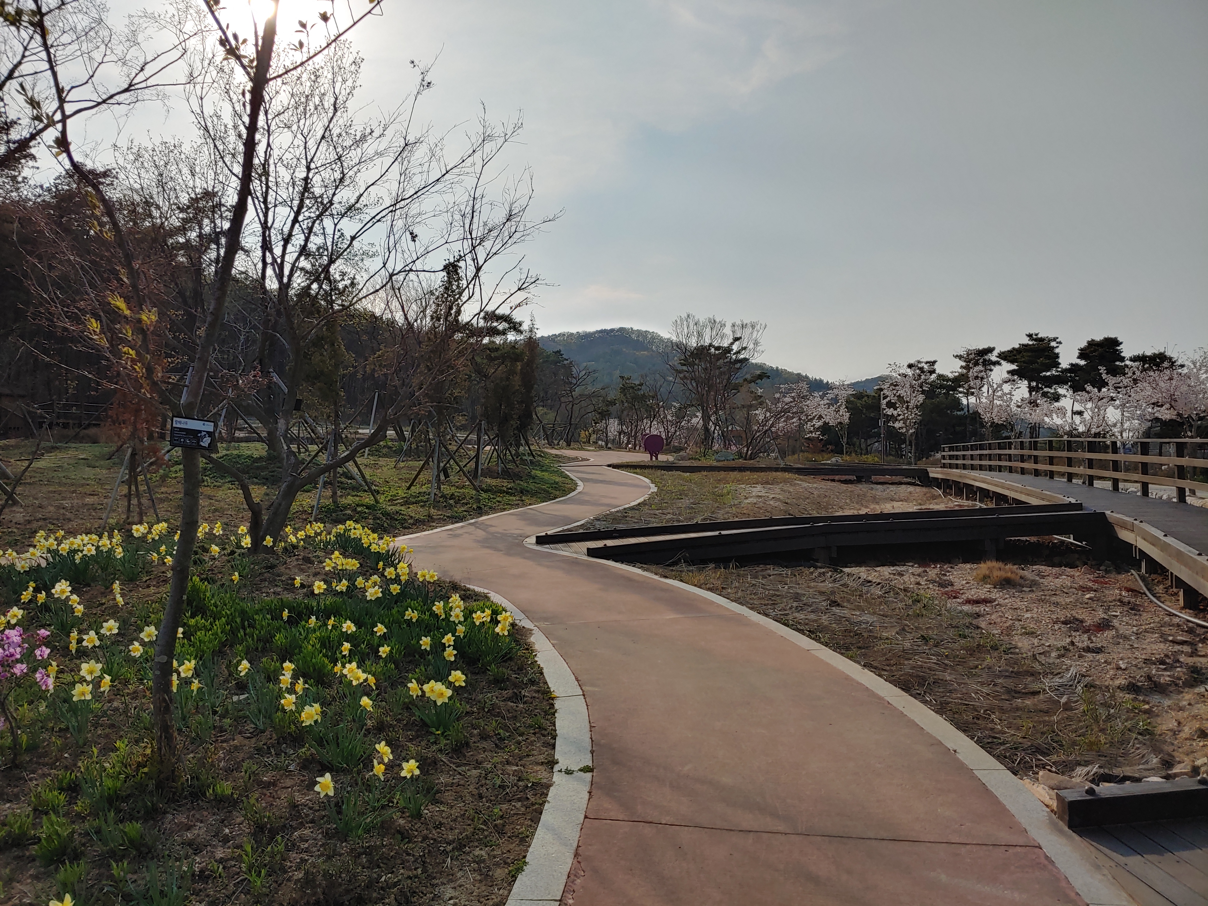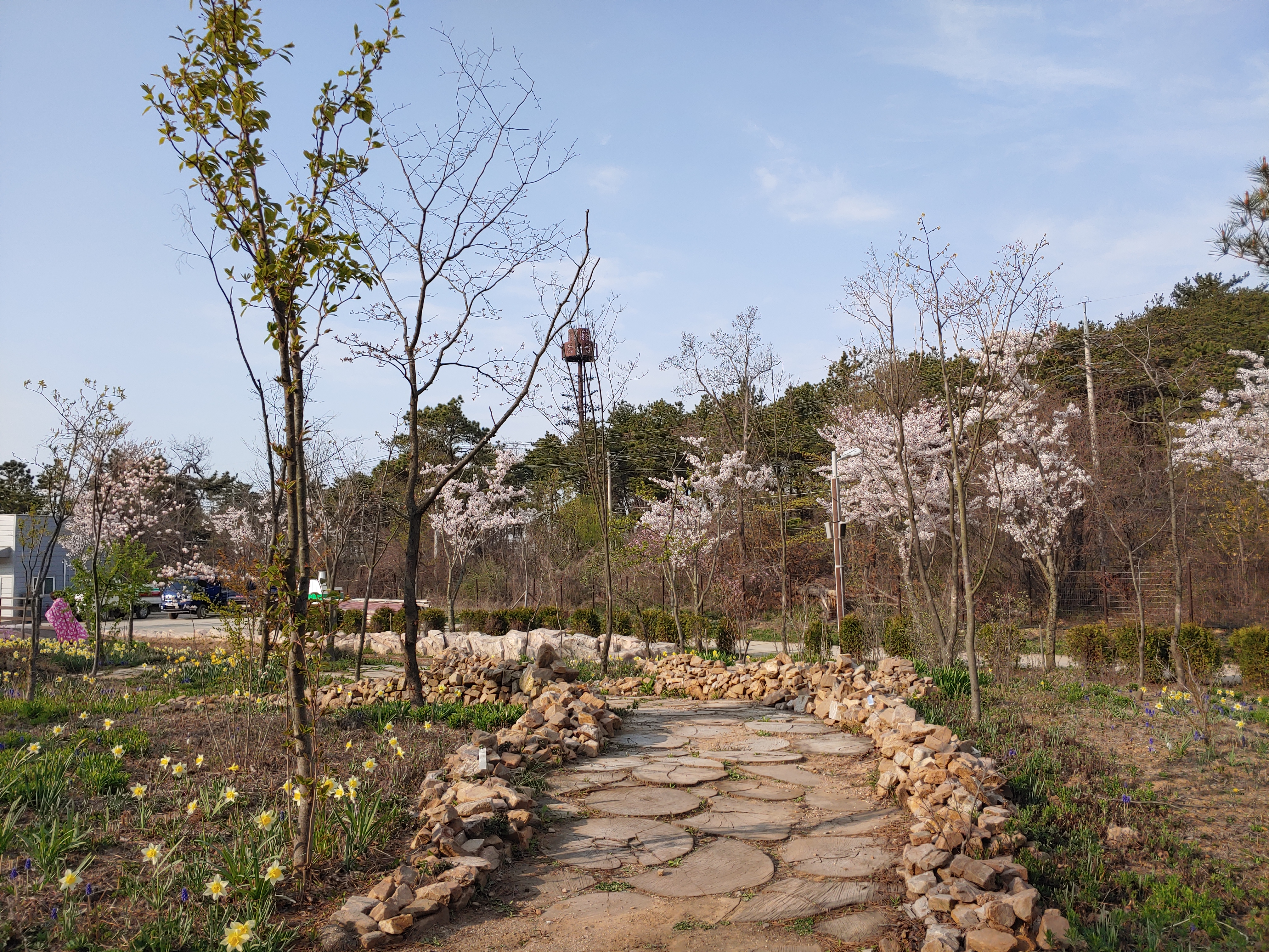 염생 식물원, 알뿌리원 쪽 돌담길에 벚꽃과 수선화과 활짝펴서 이쁜 꽃길이 만들어져있더라구요