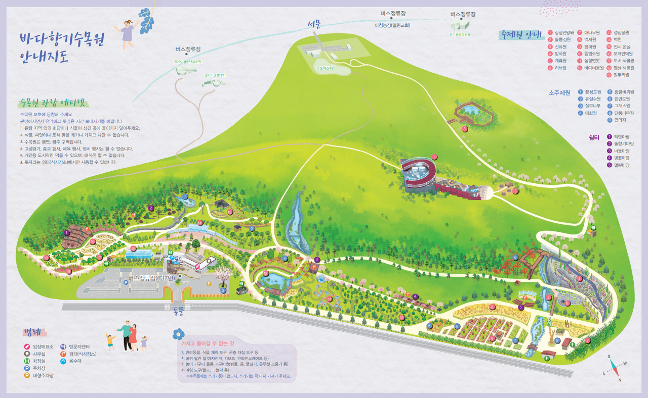 국내에서 가장 긴 아트슬로프와 1004개의 풍경이 달려있는 소리나는 꿈나무를 만날 수 있는 상상전망대와 국내 최대의 암석원과 아름다운 연꽃을 감상하며 개구리의 노래를 들으며 거닐 수 있는 심청연못, 5월부터 늦여름에는 1,300여본의 화려한 장미꽃을 감상할 수 있는 장미원과 바다가 너울거리는 모습을 형상화하여 선감도 대흥산 계곡 물을 모아 만든 생태연못인 바다너울원이 바다향기수목원 주요 주제원인데 하나도 못보고 왔어요 ㅜㅜ