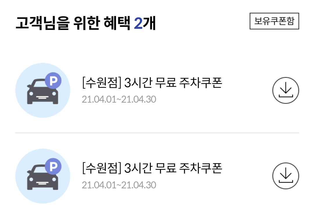 회원가입하고 로그인해야 쿠폰 다운 및 사용 가능하며 ID당 월 2매 제공되고 1일 1회 3시간 무료주차 혜택을 제공 받을 수 있어요