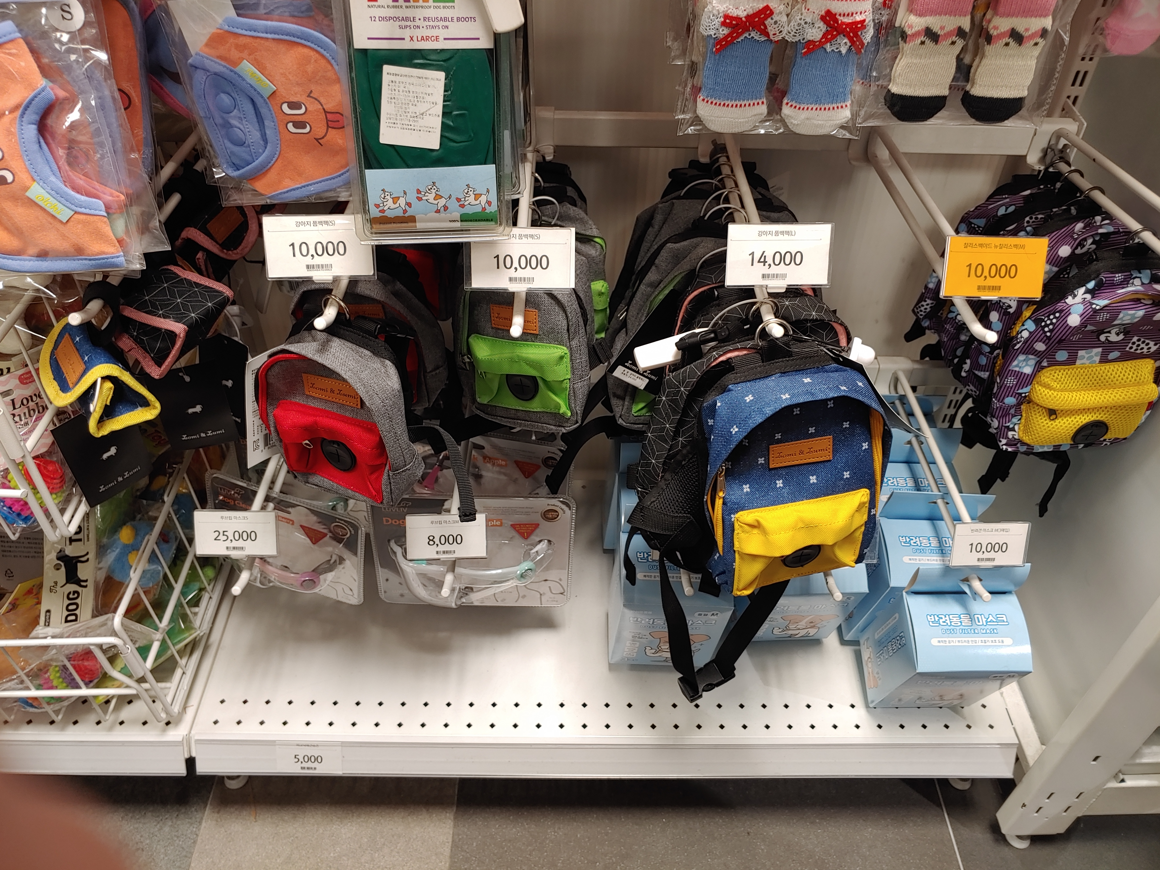 아기자기한 댕댕이 액서사리들과 귀여운 댕댕이 가방, 반려동물 마스크도 있어요