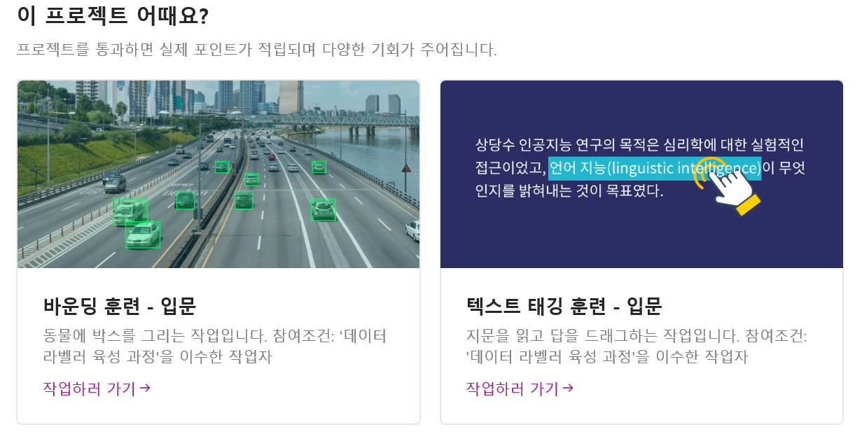 데이터 라벨라 육성과정 끝내면 프로젝트에 참여할 수 있는데요 단가가 괜찮은 프로젝트는 조금 까다로운 프로젝트들 이구요 PC로만 가능한 프로젝트들도 있어요