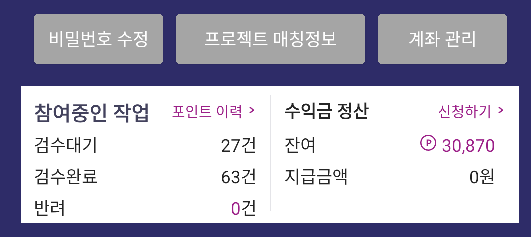 완료된 작업 별 단가 및 작업건수에 따라 수익금 확인이 가능하고 5,000포인트 이상 부터 1,000원 단위로 수익금 정산을 받을 수 있어 수익금 정산도 마음에 들더라구요