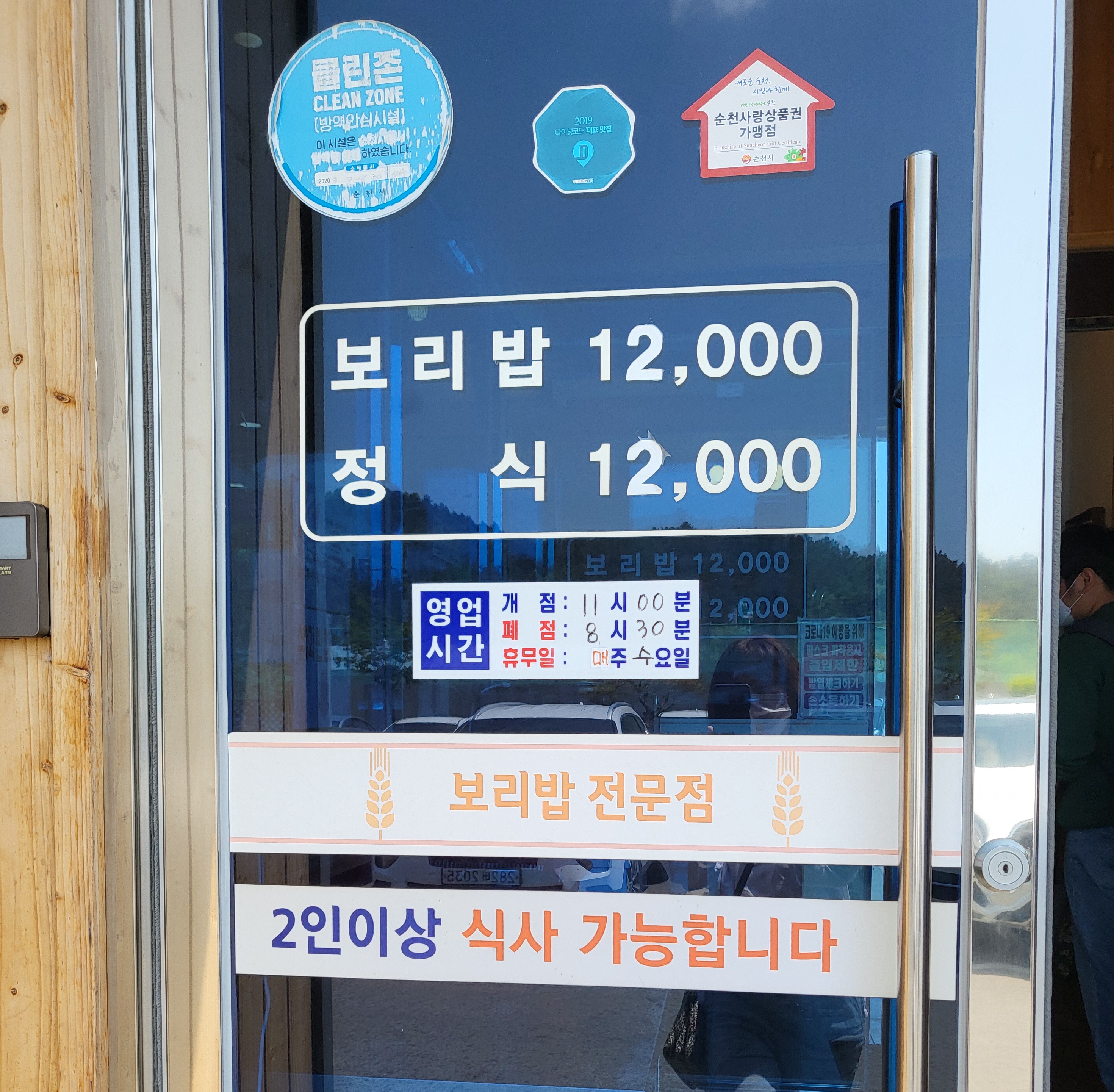 보리밥정식과 정식 가격 모두 인당12,000원이에요