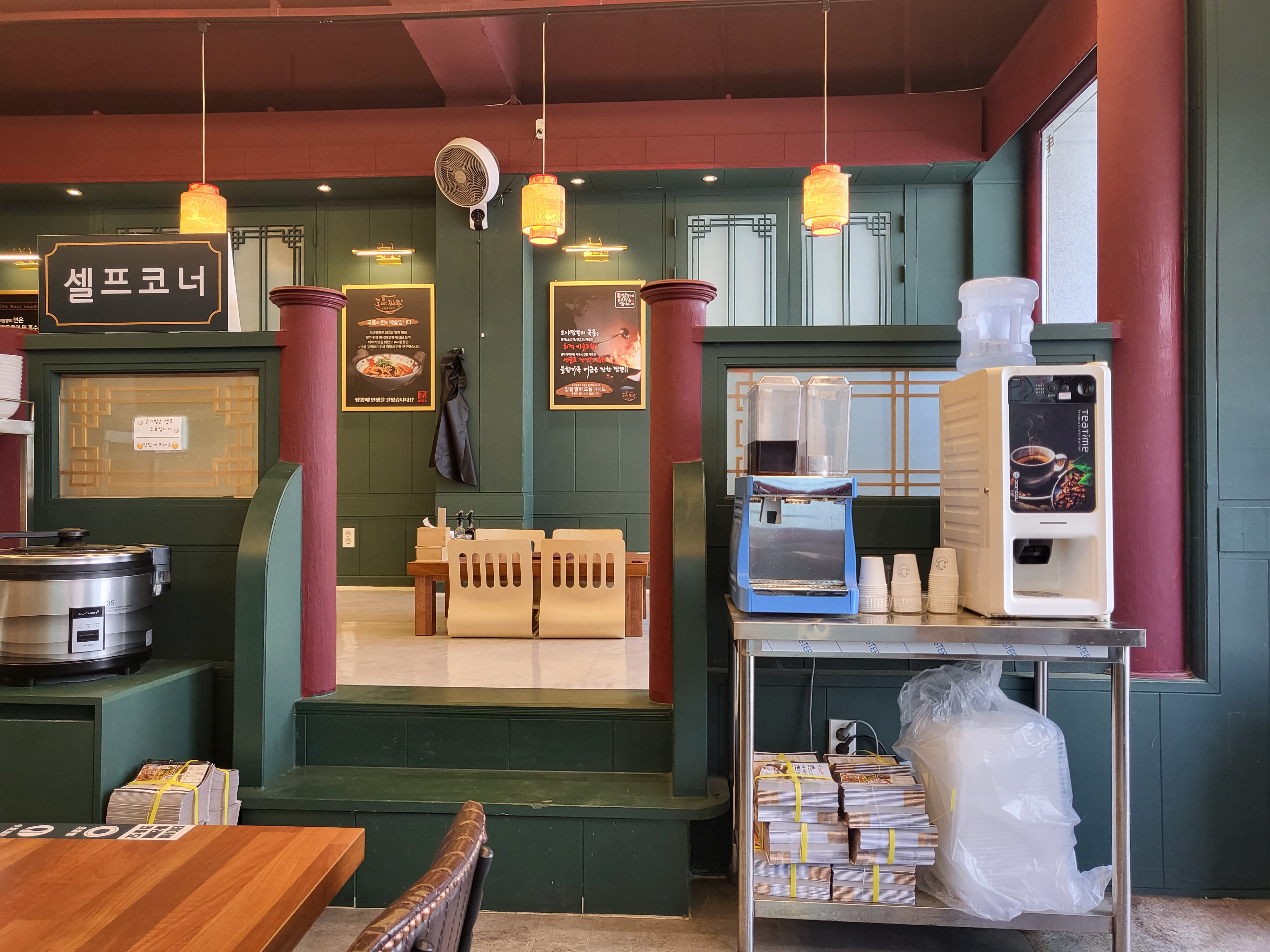홀이 넓지는 않지만 테이블자석도 있고 좌식자석도 있고 반찬등이 있는 셀프코너도 조그맣게 마련되어 있어요