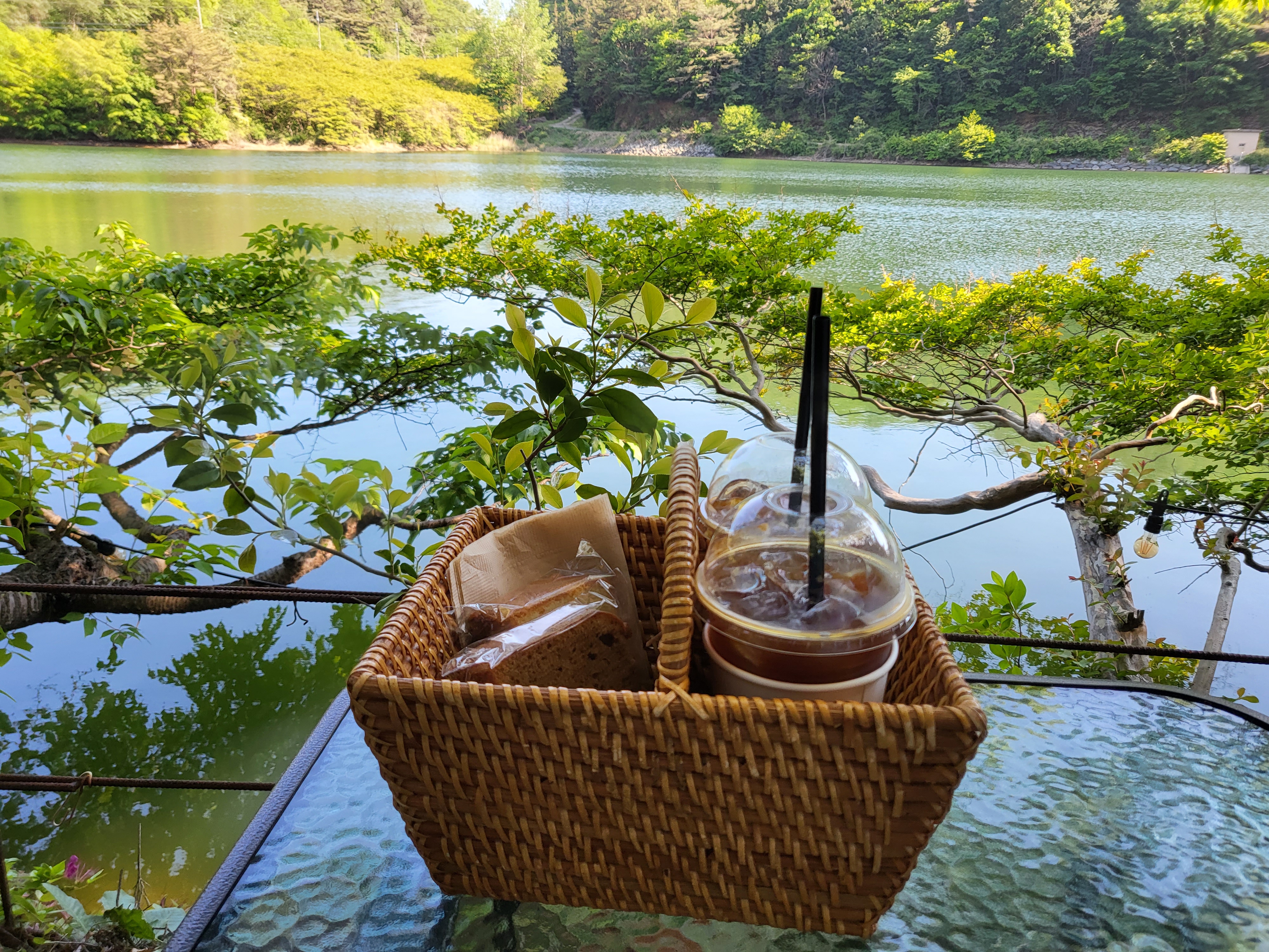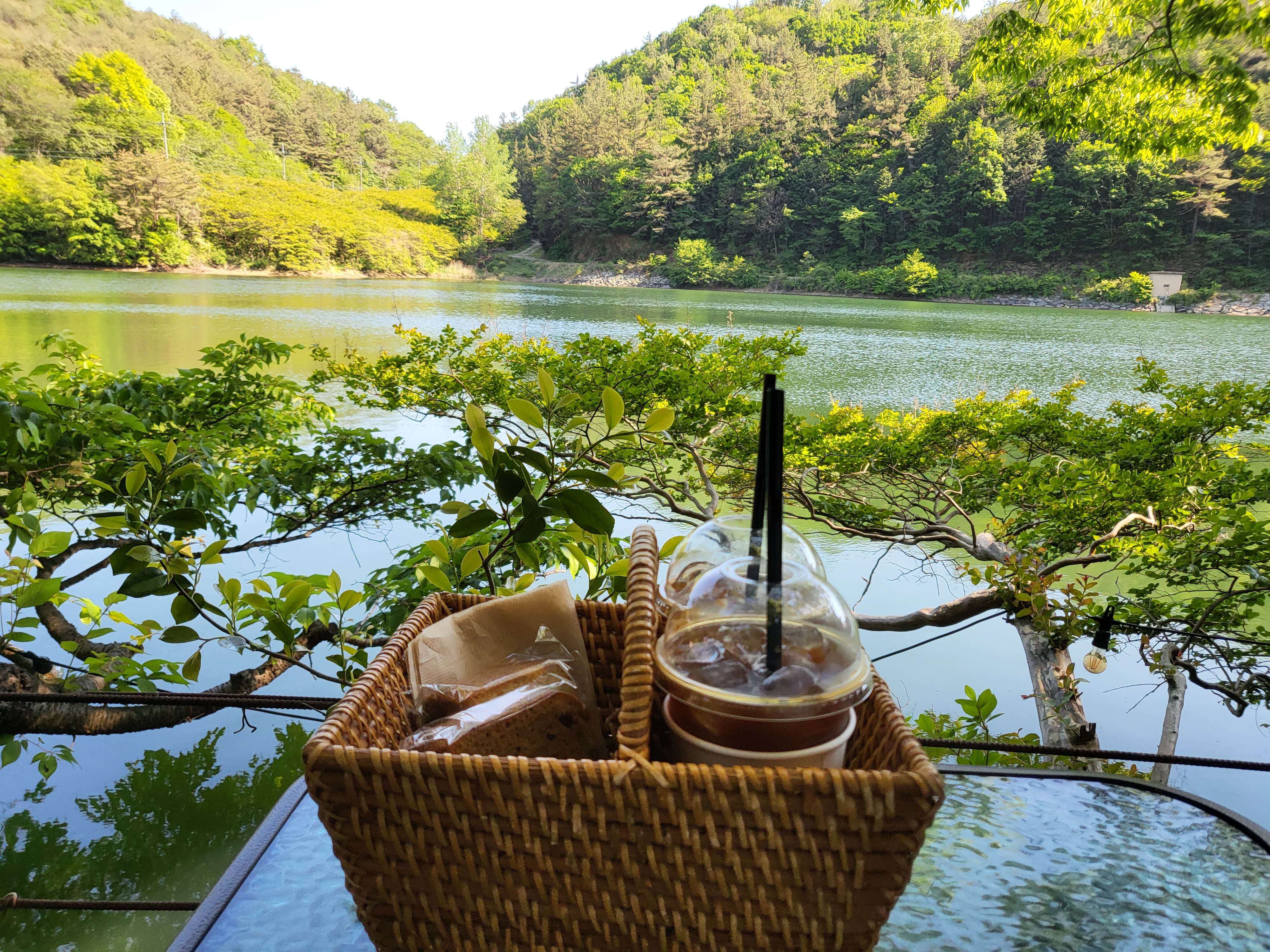호수배경으로 커피와 디저트 바구니도 한컷 찍어주고 시원한 커피한잔하며 잠시나마 여유로움 느낀 감성야외까페였어요