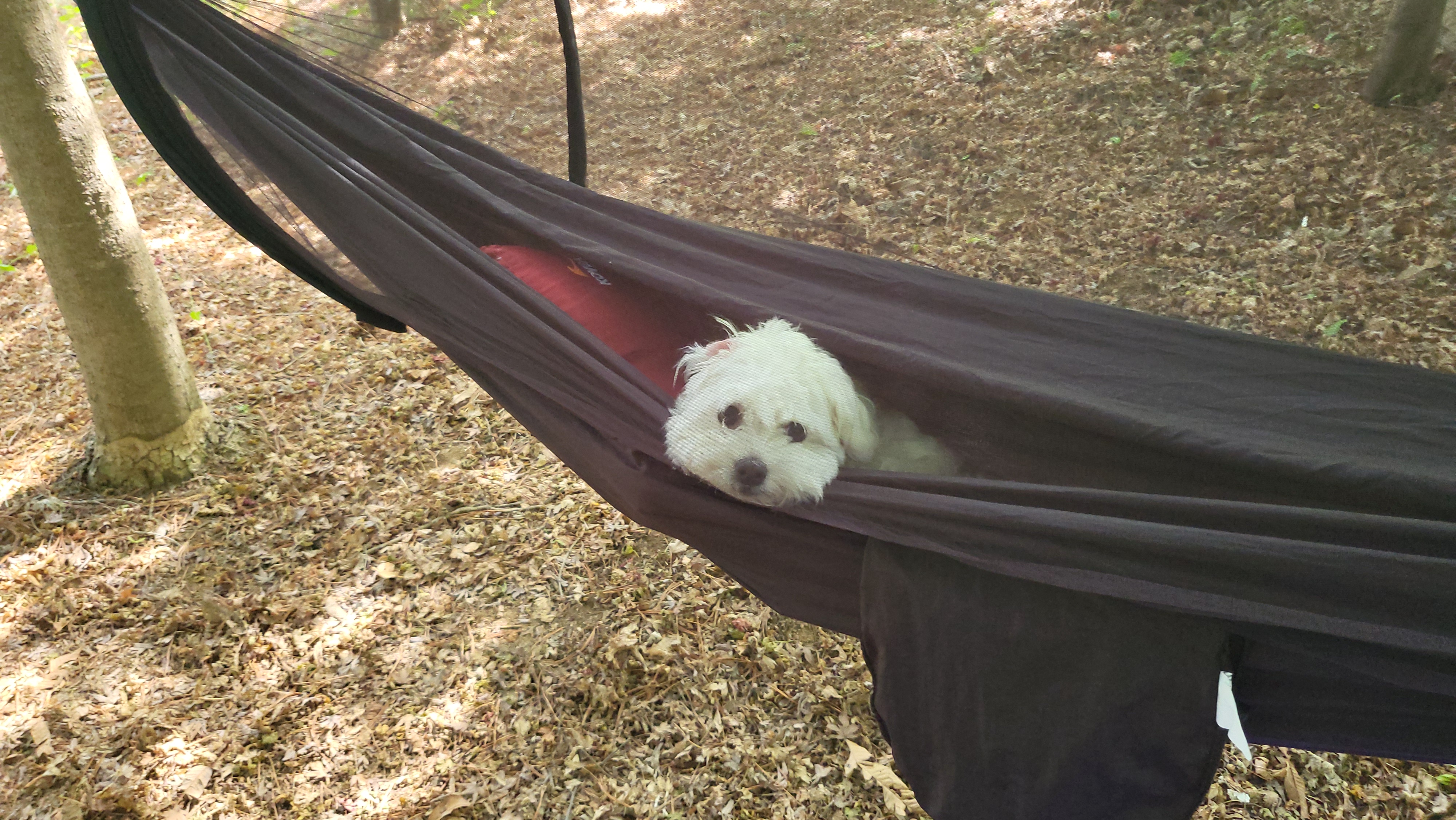 울집 강아지 말티푸 겨울이와 산으로 산책갔다가 날이 좋아 해먹에서 여유 좀 부려보려고 해먹 설치했는데
