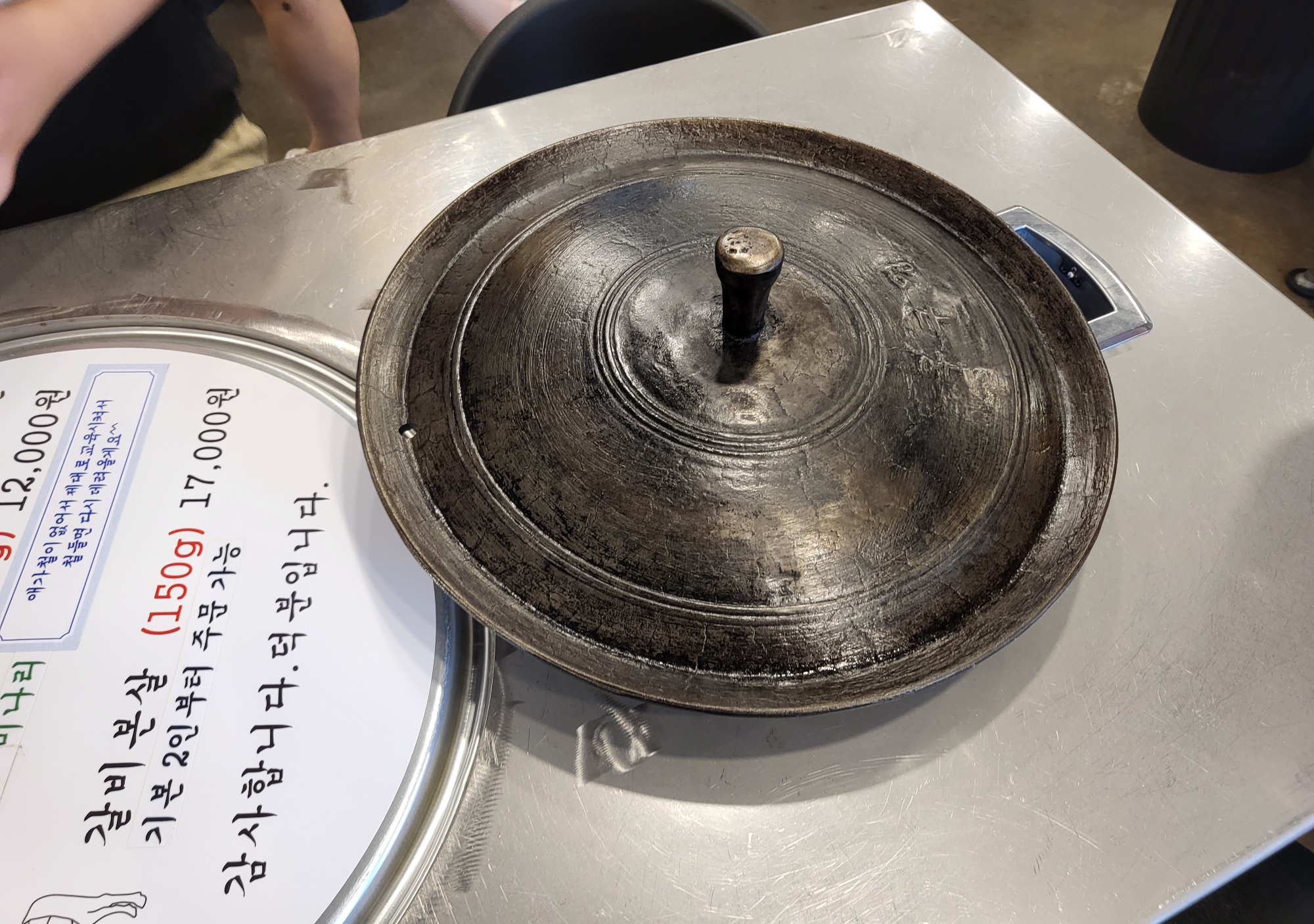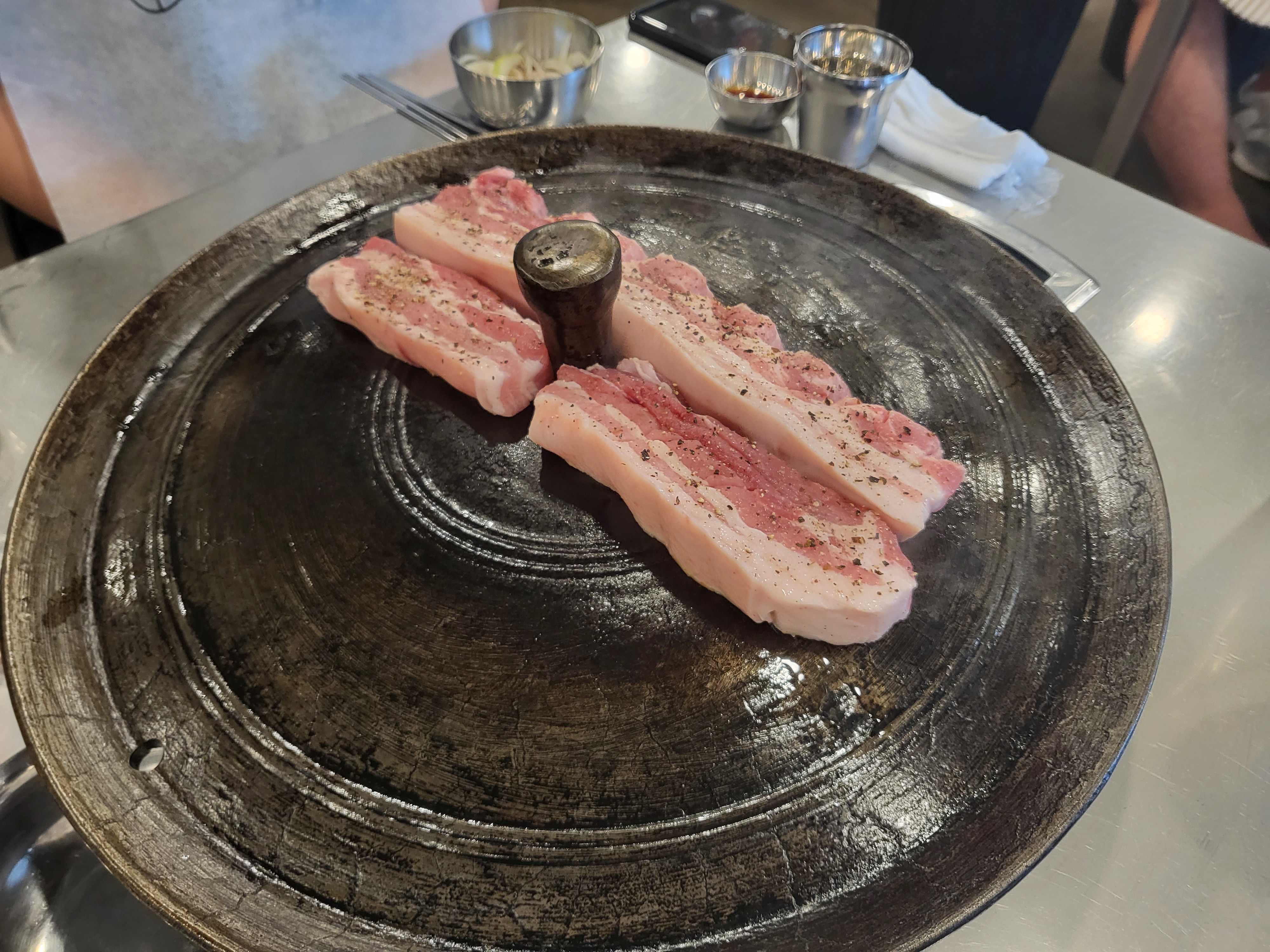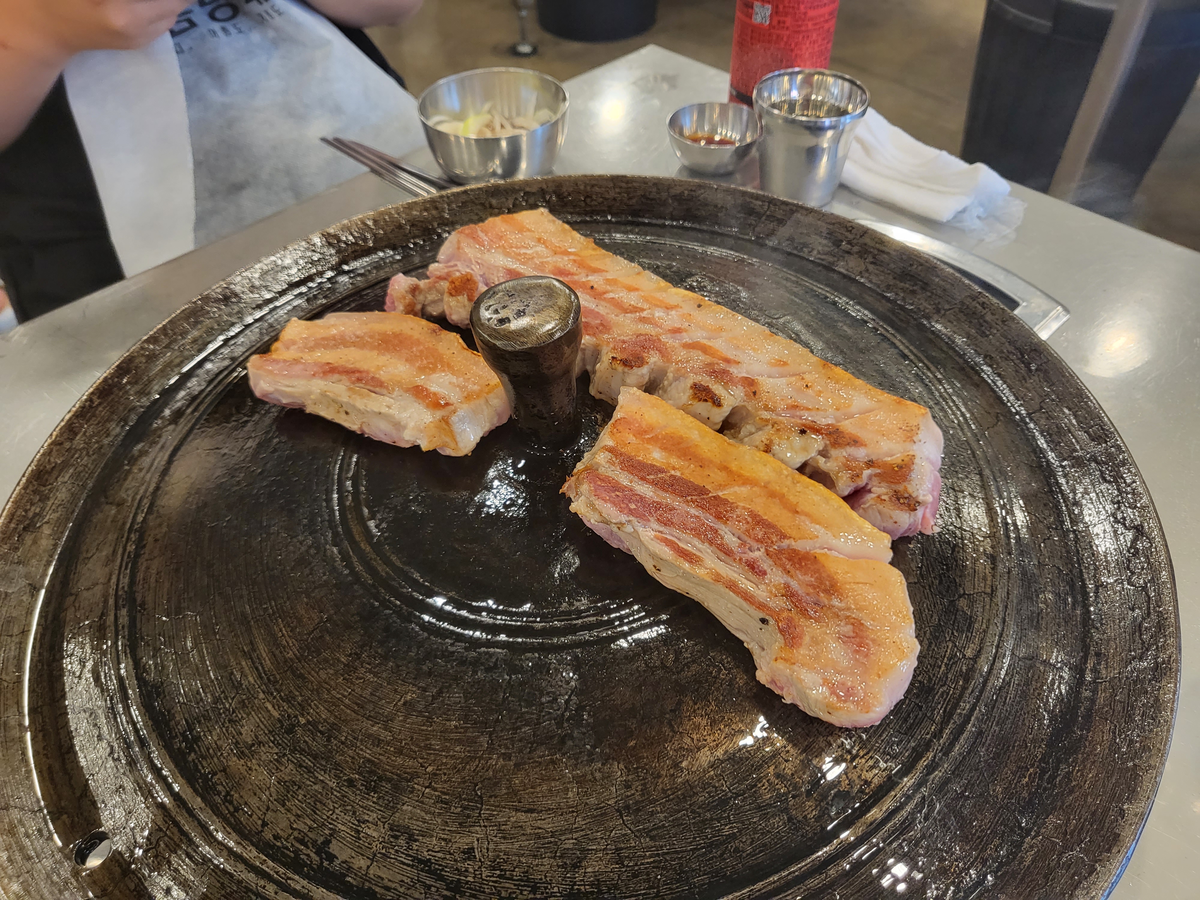 그냥 먹어도 맛있는 겹살이를 솥뚜껑에 구워먹으면 고소한 겹살이 맛이에요