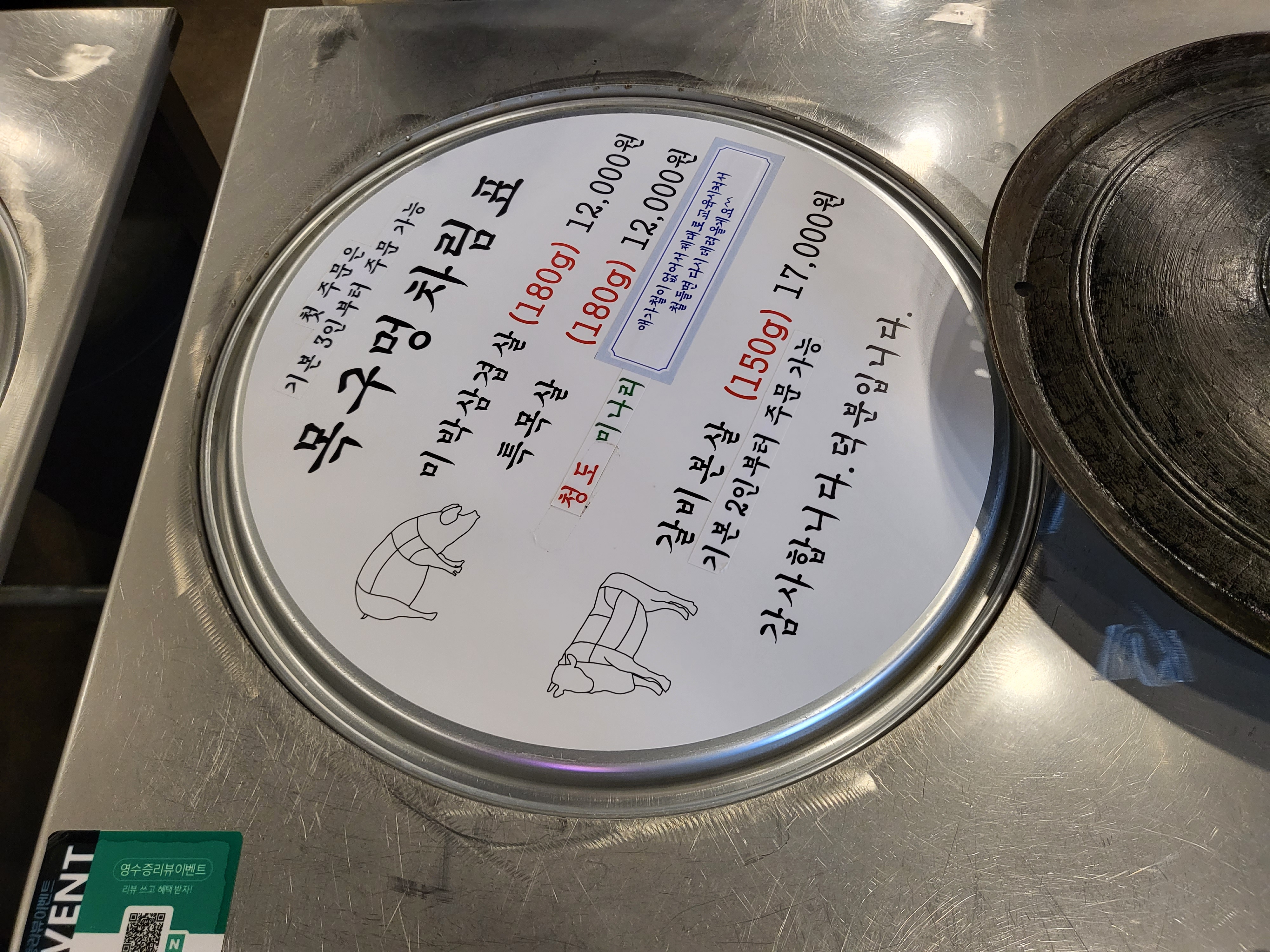 목구멍 차림표 미박삼겹살 180g에 12,000원이에요