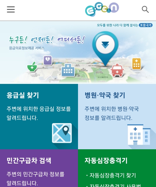 추석에 혹시라도 아파서 병원이나 약국에 갈일이 생긴다면 응급의료포털사이트에서 주변에 위치한 병원 약국 정보를 알 수 있어요