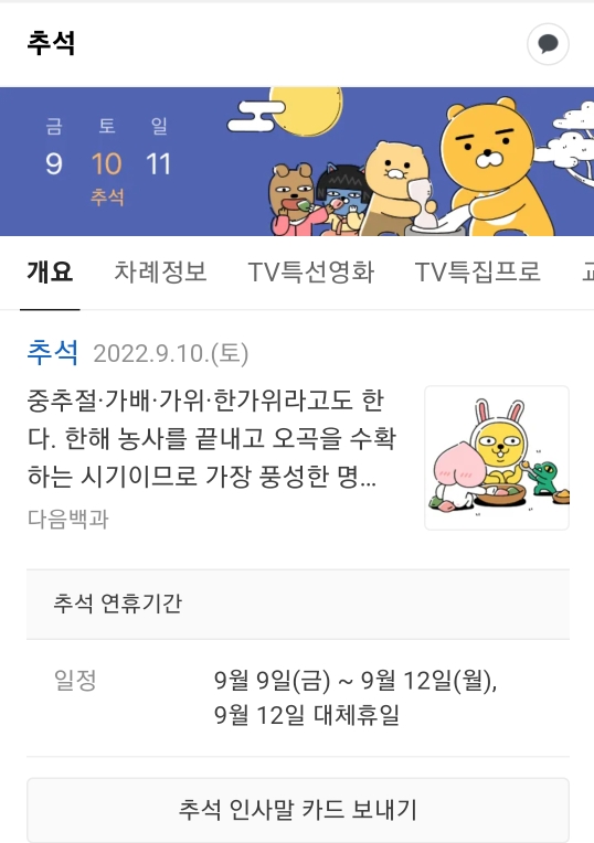 다음에서는 추석 차례정보와 tv특선영화. tv특집프로. 교통정보를 알 수 있어요
