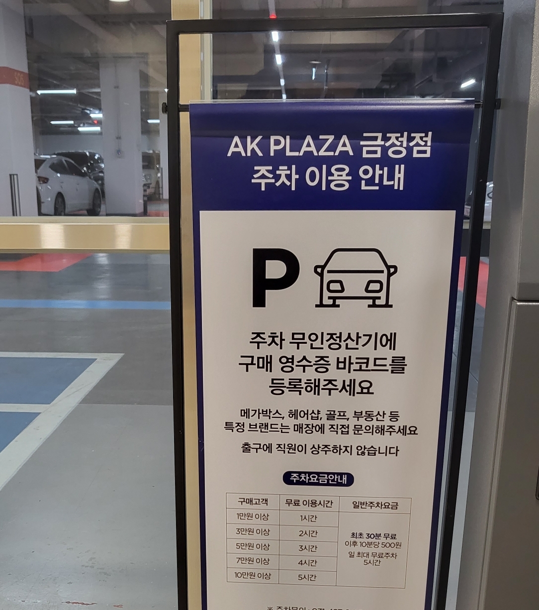 ak금정점에서 쇼핑했다면 구매금액에 따라 주차무료시간이 있어요