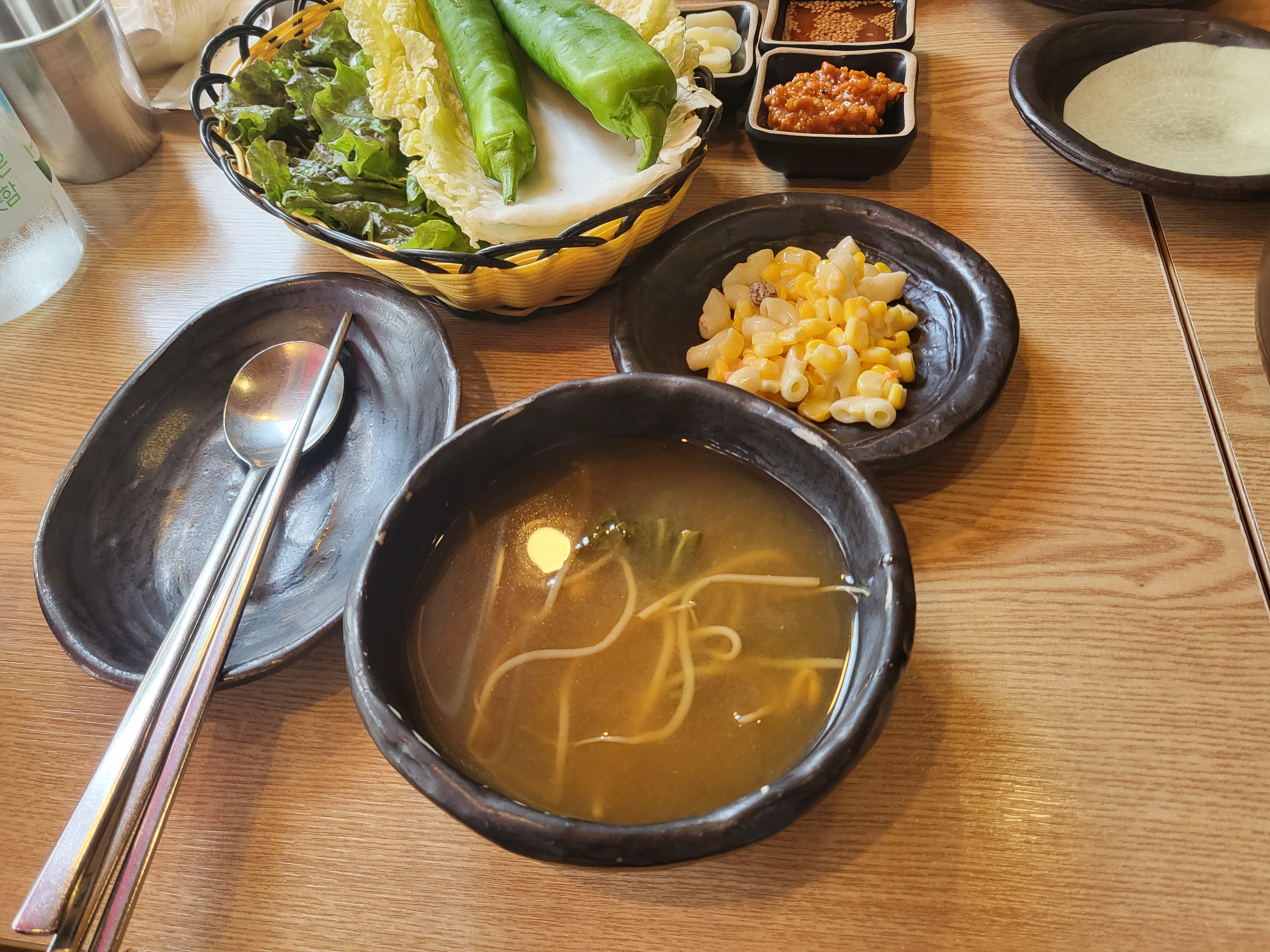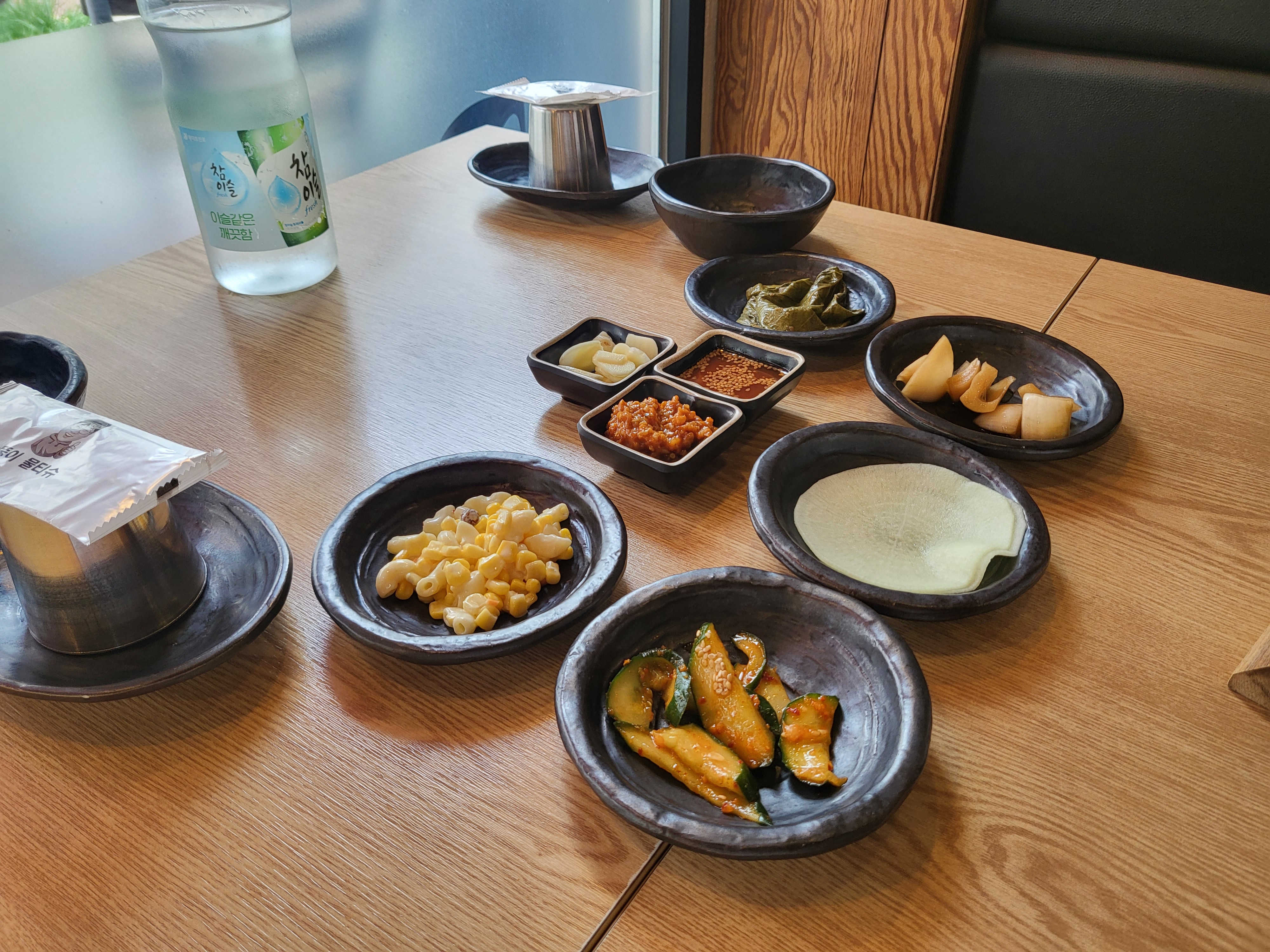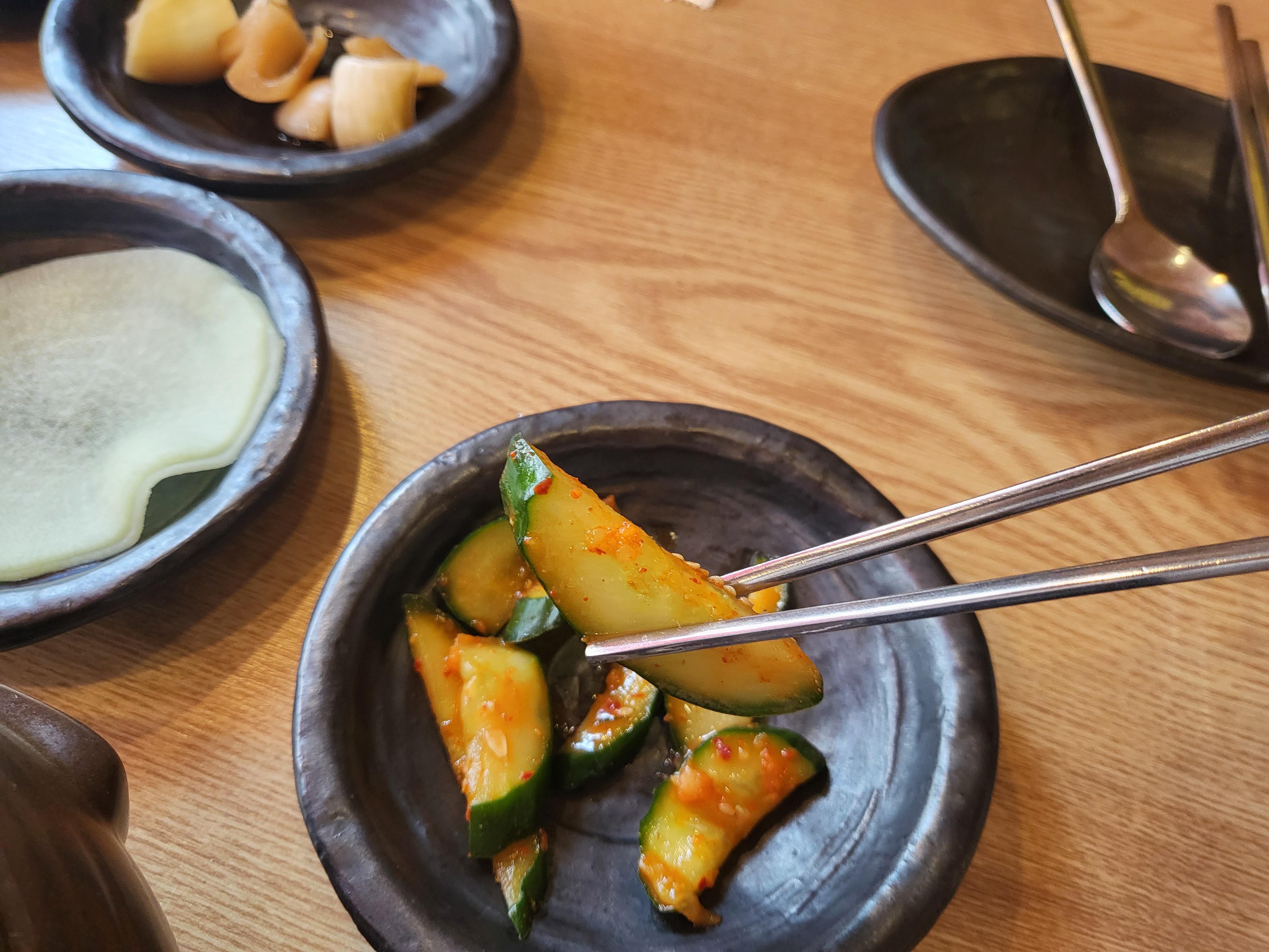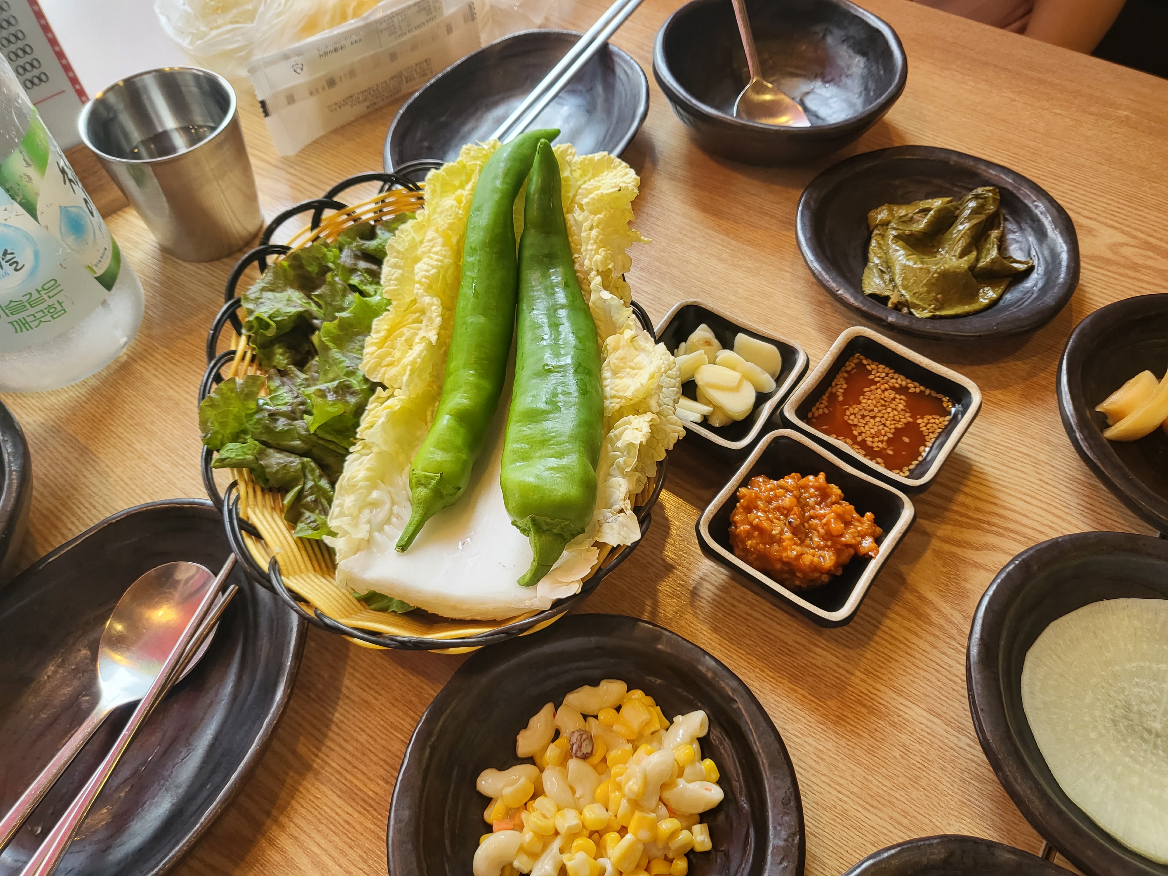 아삭아삭 오이무침과 새콤달콤 양파피클 쌈무와 언제나 맛있는 마요네즈 옥수수 샐러드와 깻잎절임도 나와요