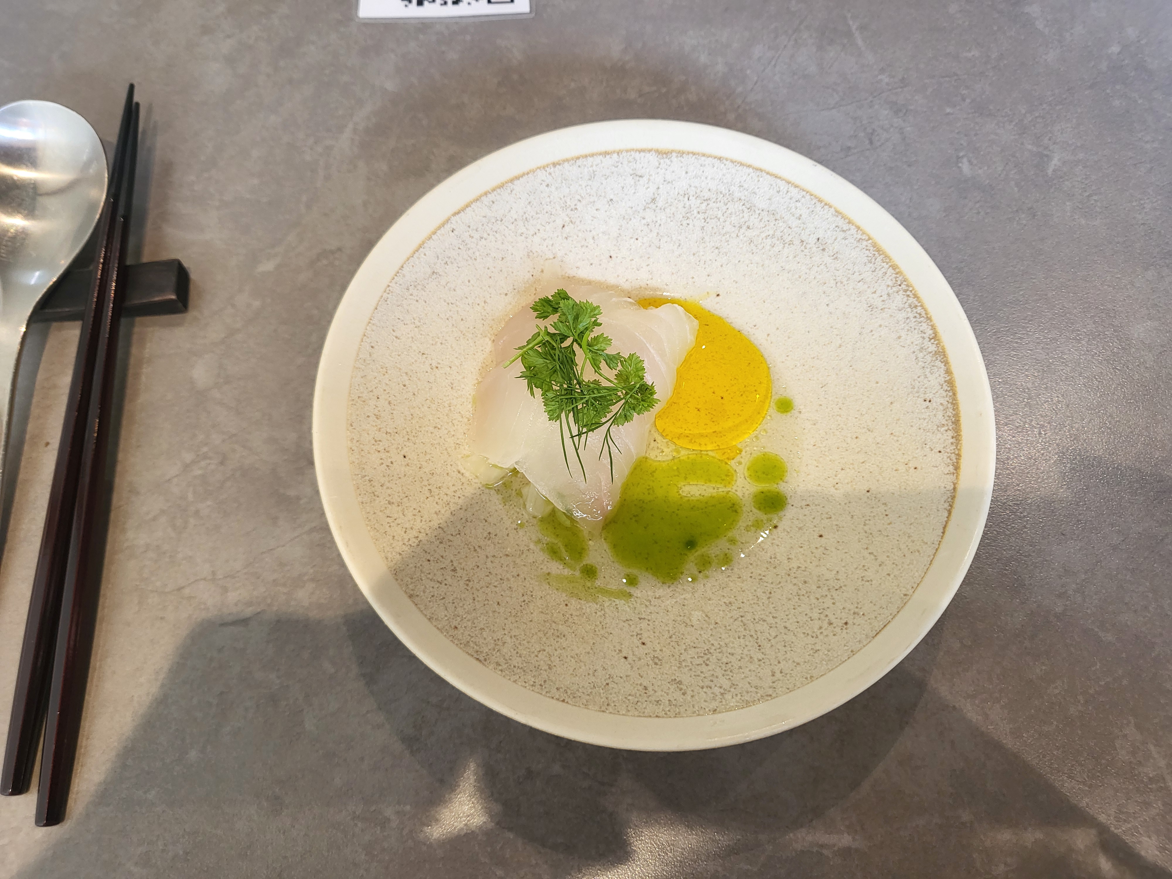 첫번째로 광어회에 참외와 소스 곁들어 먹는