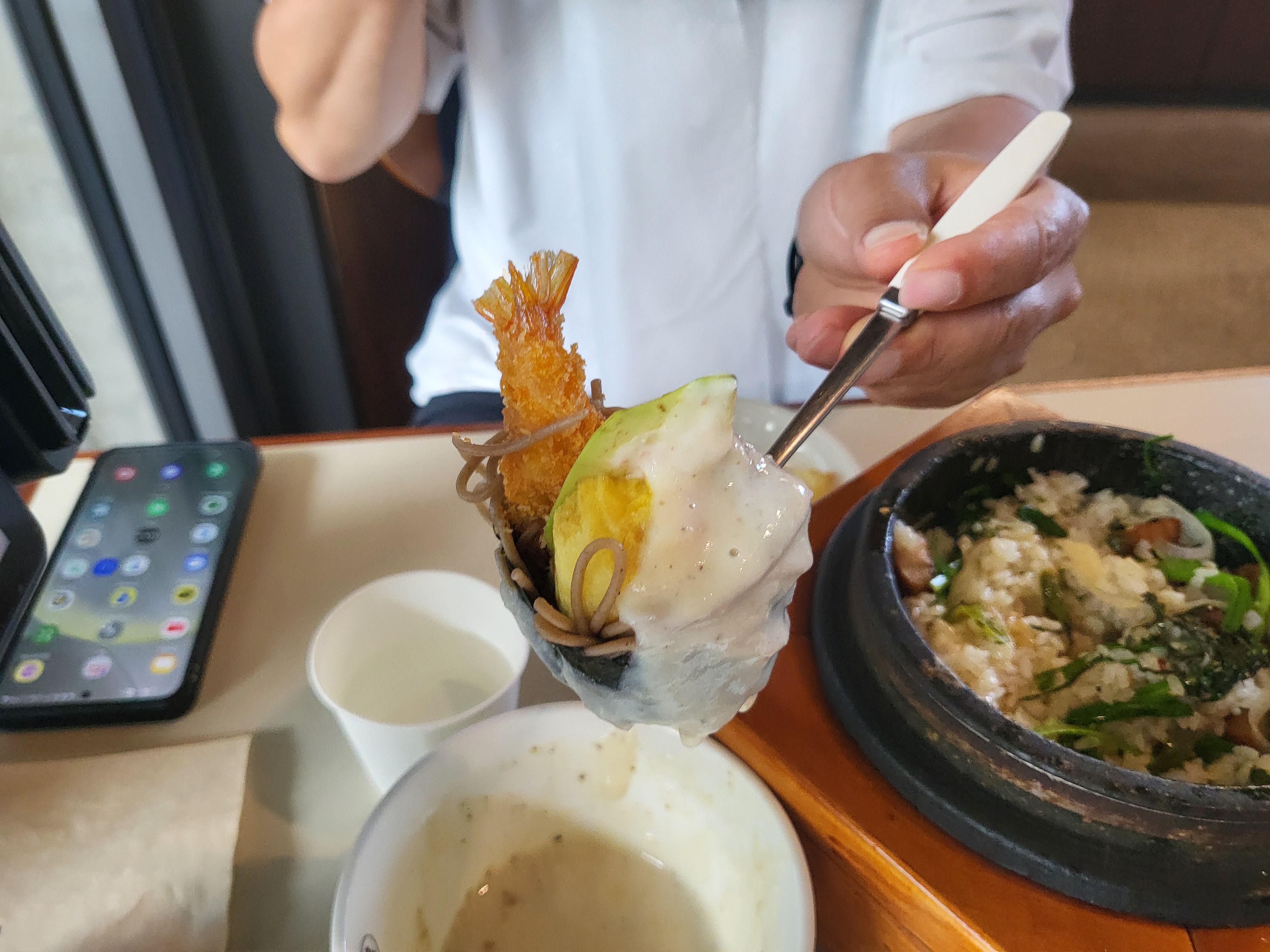 새우튀김.아보카도.계란지단.메밀면의 조합