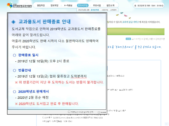 도서교체 작업으로 인해 2019학년도 교과용도서는 2019년 12월 10일 판매종료 되었구요 2020년 2월 중순 정도부터 판매가 개시된다고 해요