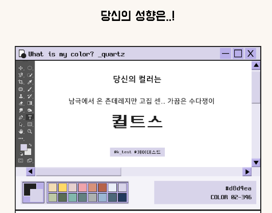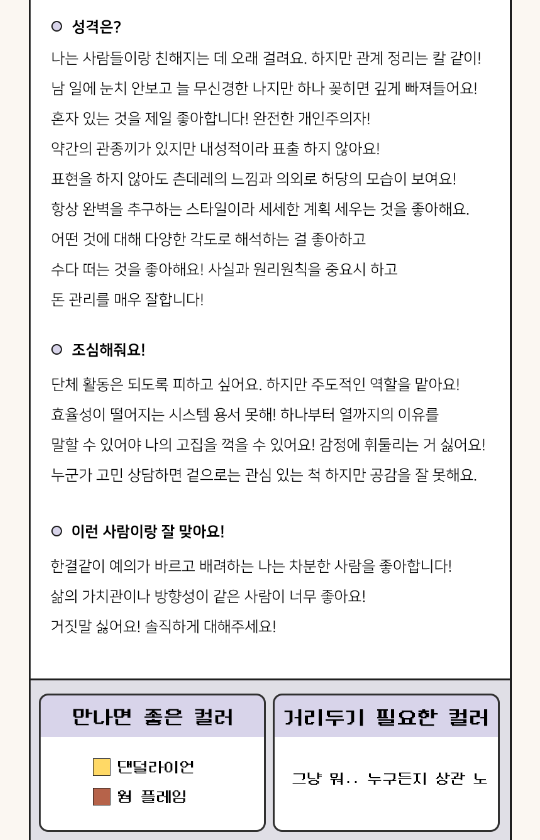 케이테스트는 나름 잘맞는거같습니다. 저는 bmti 테스트할때는 용의주도한 전략가인 intj가 나왔는데요. 퍼스널컬러 알아보러가기(클릭)<ㅡㅡㅡ 제 퍼스널컬러 결과는 뭐가 나왔을까요? 당신의