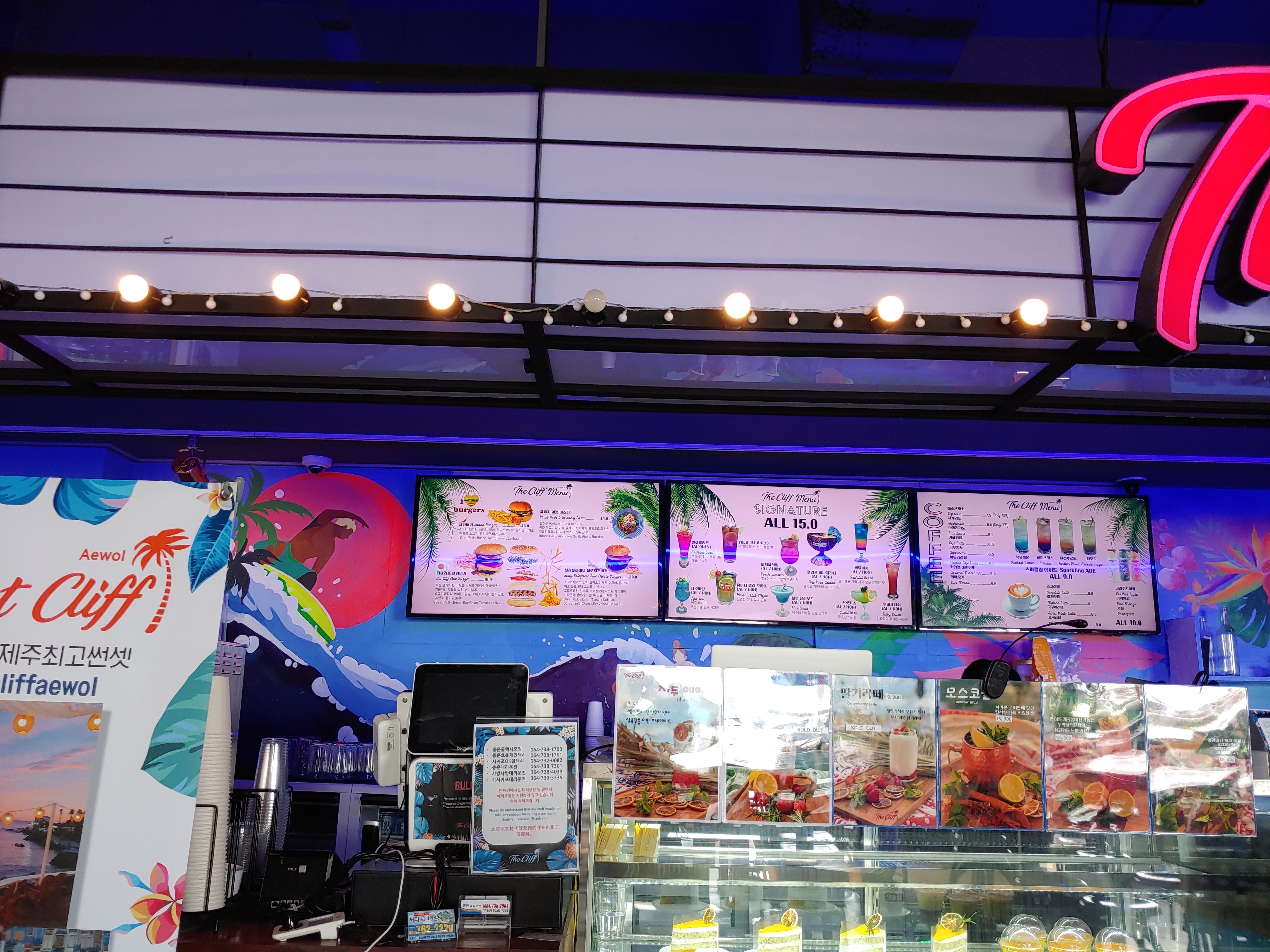 더 클리프 카페 네온사인과 식물들로 화려하게 꾸며진 실내는 외국바에 와있는 느낌이 드는데 너무 화려해서인지 조금 정신없어 보이긴 했어요