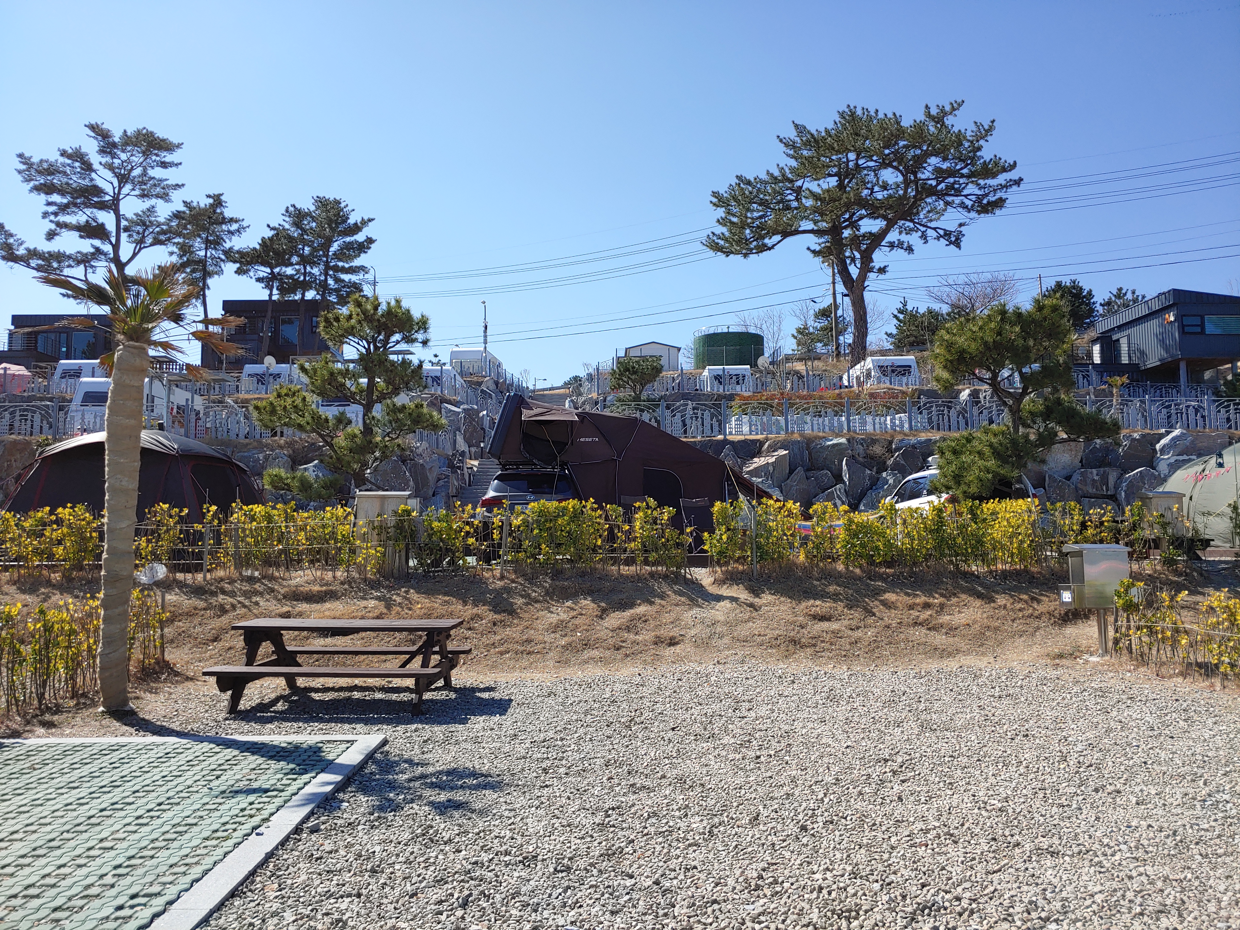 사이트가 층층이 되어있긴한데 콩자갈사이트에서 텐트를 치면 데크사이트는 바다가 시원하게 보이지않지만 루프탑텐트는 시원한 바다뷰를 볼 수 있었지요 이런게 루프탑텐트의 장점이랄까요 ㅋ