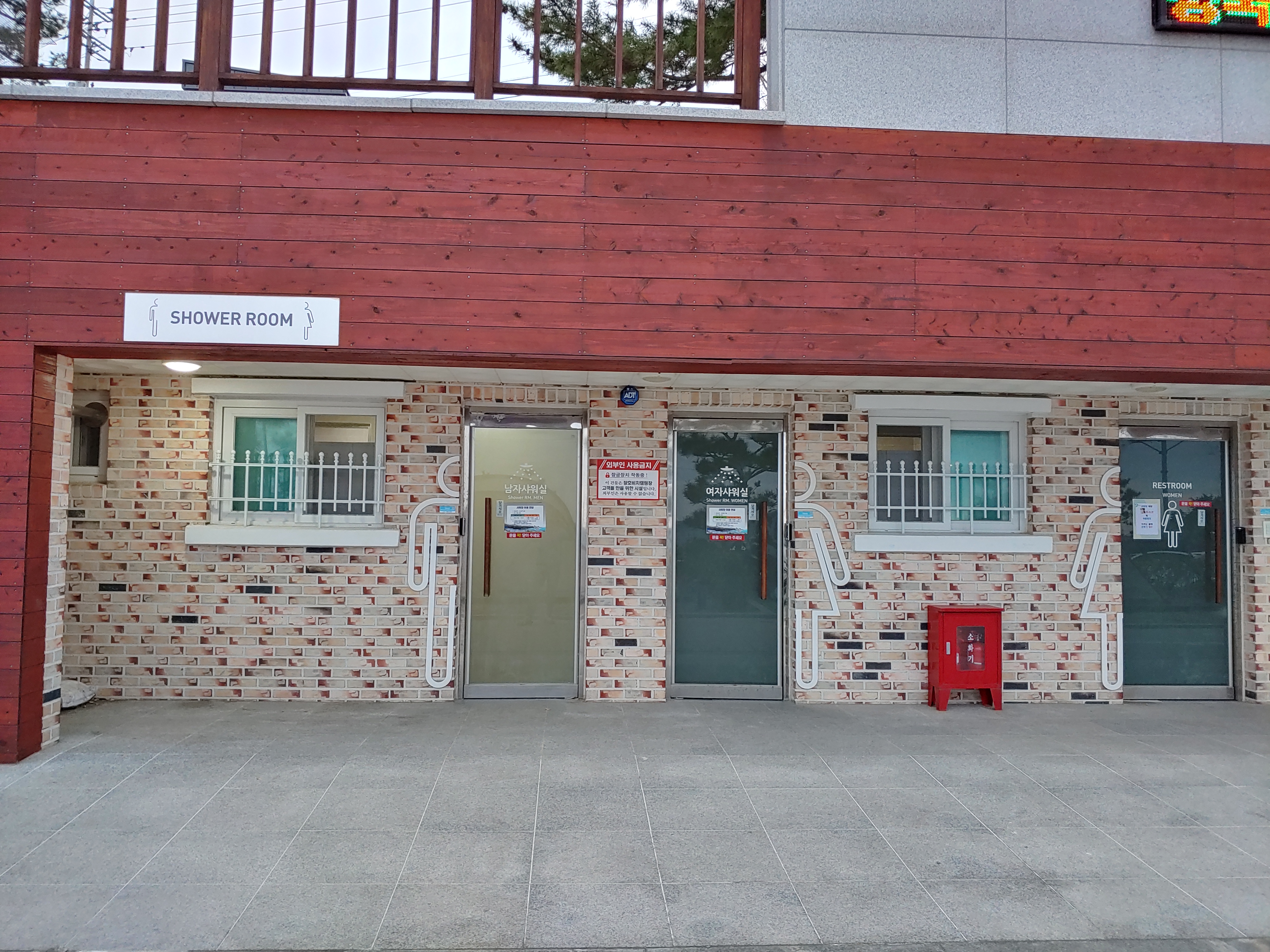 장호오토캠핑장 c7,8,9사이트 앞에 개수대,샤워실,화장실이 한 건물에 같이 있어요