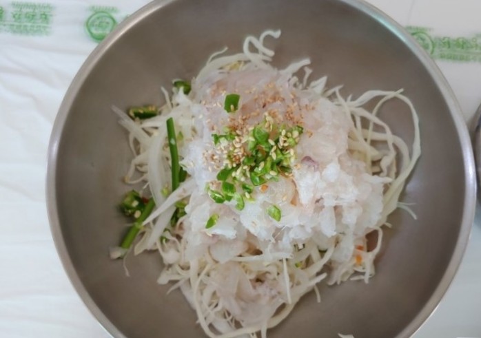 꼬득꼬득 얇게 잘썰린 잡어가 들어간 잡어물회엔 잡어양이 제법 많이 들어있어요