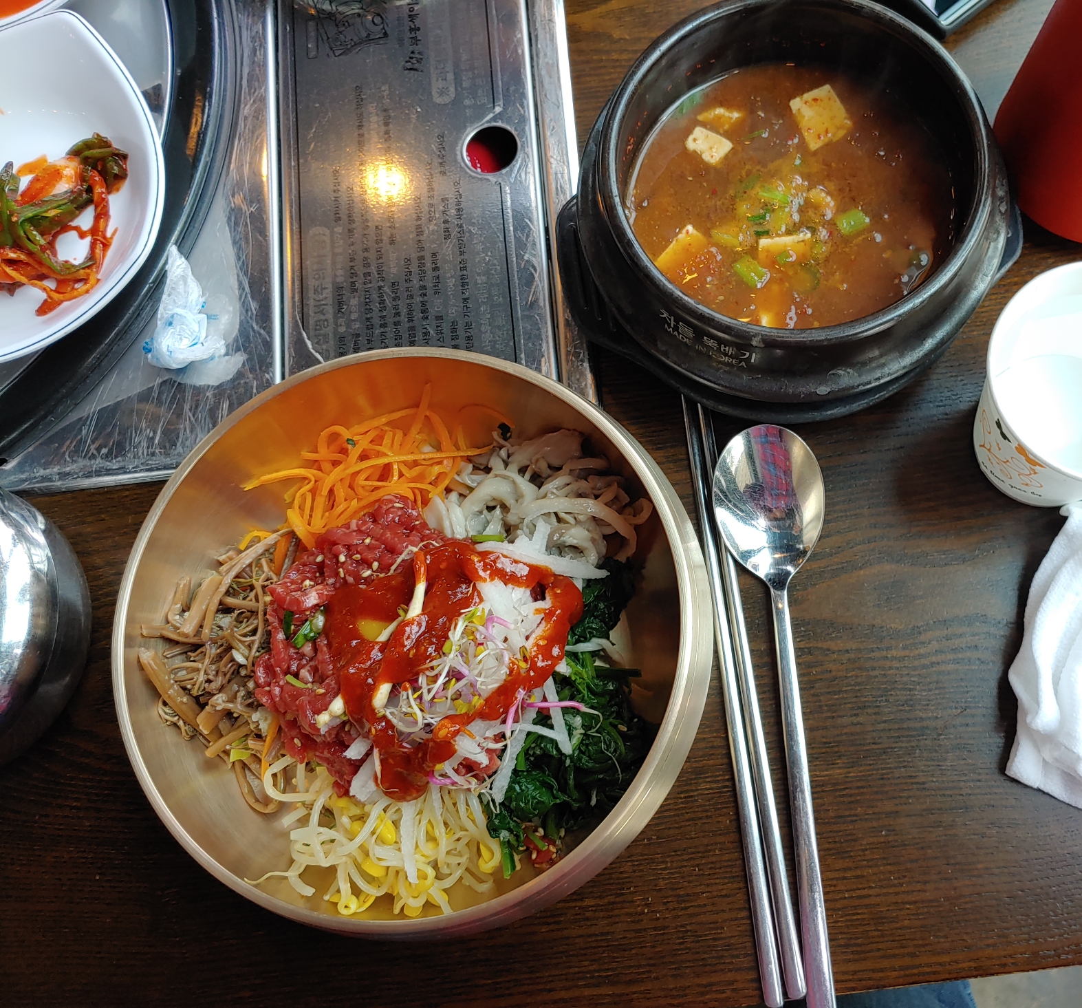 육회비빔밥은 된장찌개하고 같이 나와요 맛은... 육회비빔밥 맛이죠