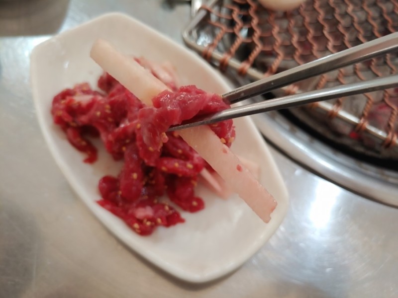 서비스로 나오는 육회 단짠의 양념과 배도 들어있는데 양도 맛도 너무 맛있는데 서비스라니.. 너무 좋더라구요