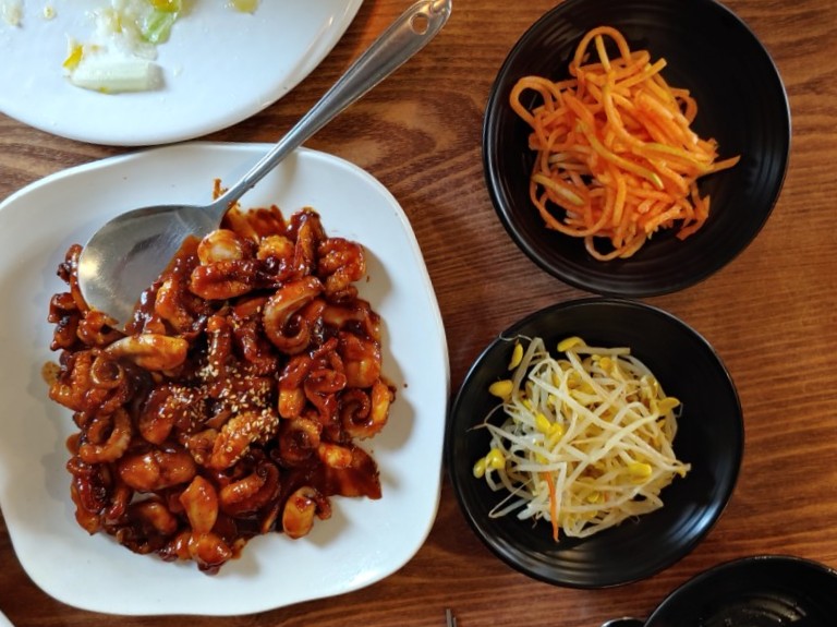 무생채와 콩나물이 반찬으로 나오는데 쭈꾸미볶음과 같이 비벼먹으면 더 맛있고 반찬으로 그냥 먹어도 맛있어요