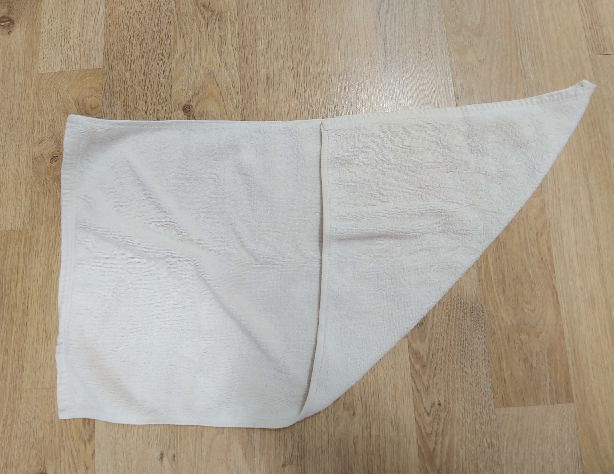 수건 펼치고 수건 한쪽부분을 삼각형모양으로 접어주세요