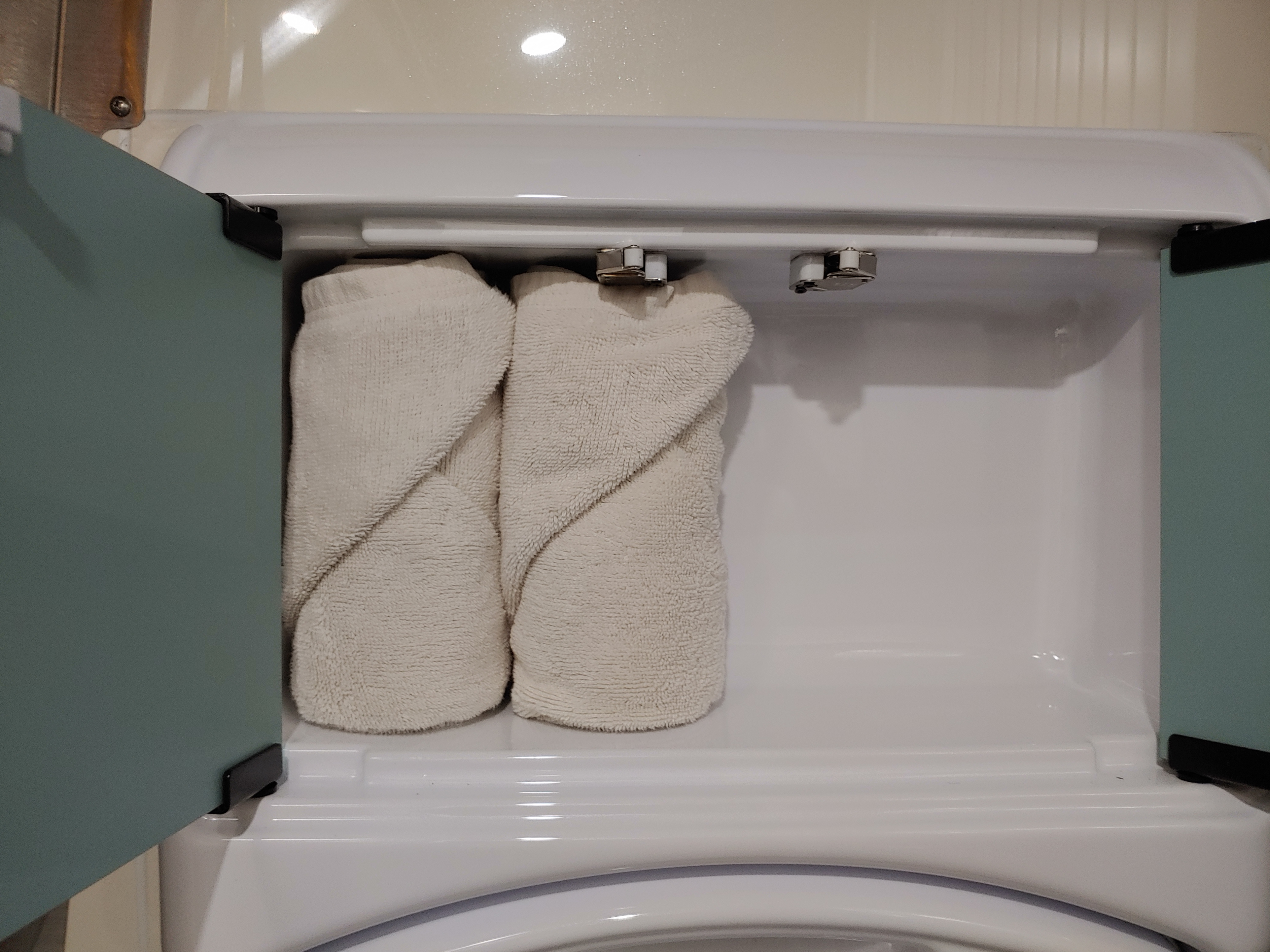 카인드캠핑카 아크m3욕실장에 호텔식 수건 접는 방법으로 수건접어 수납했더니 쏘오옥 자기자리인듯 깔끔하게 맞더라구요