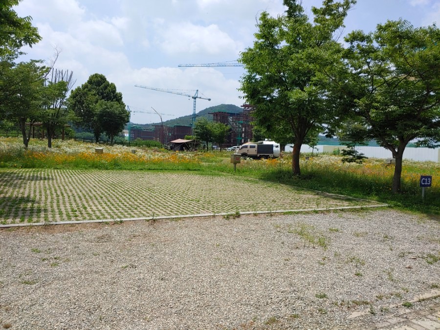 세종 합강오토캠핑장 C존 하얗고 노란 이쁜 야생화꽃들로 이쁘긴한데 나무도 별로 없고 있는 나무들도 아직 어려서 그늘이 없어요