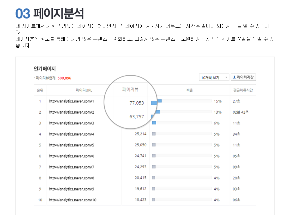 페이지분석은 내 사이트에서 가장 인기있는 페이지는 어디인지 각 페이지에 방문자가 머무르는 시간은 얼마나 되는지 등을 알 수 있고 페이지분석 정보를 통해 인기가 많은 콘텐츠는 강화하고 그렇지 않은 콘텐츠는 보완하여 전체적인 사이트 품질을 높일 수 있다