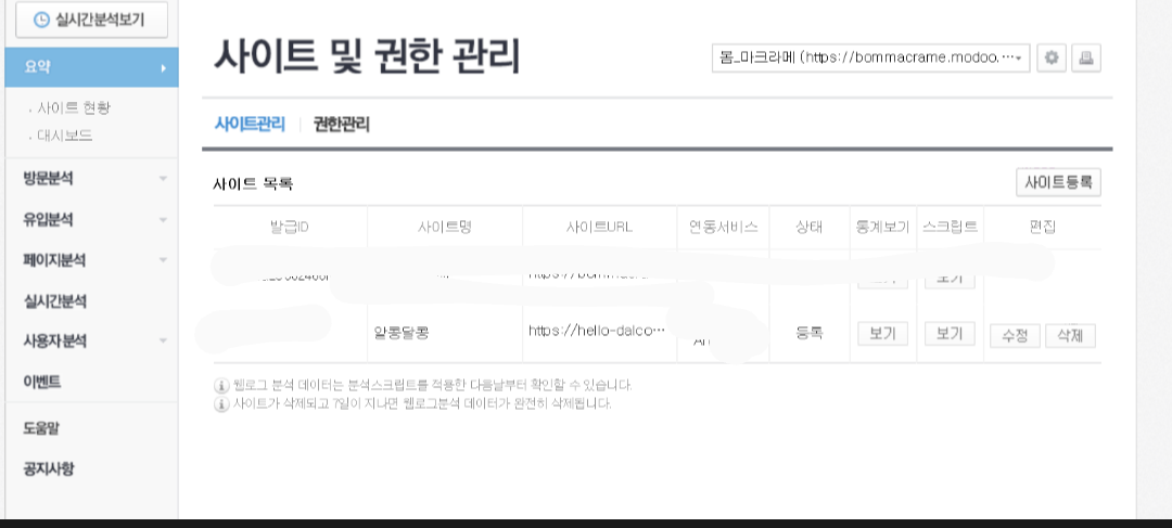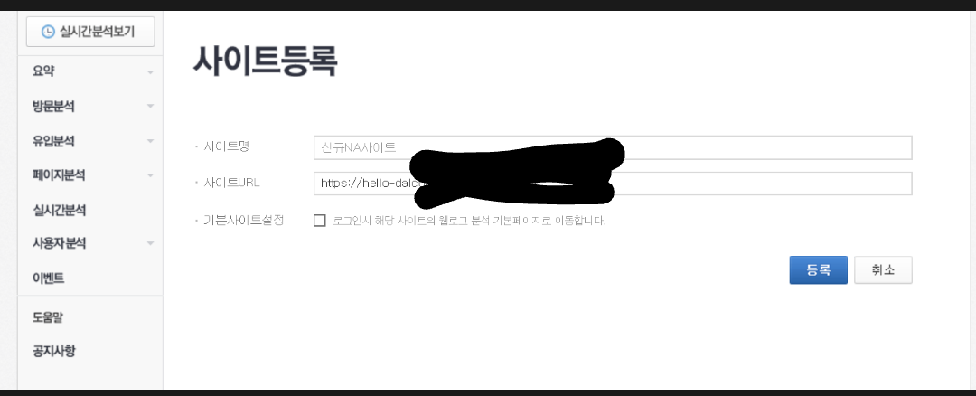 사이트등록에 사이트명은 고민할 필요없이 써주고 사이트 URL입력해주고 등록 눌러주세요
