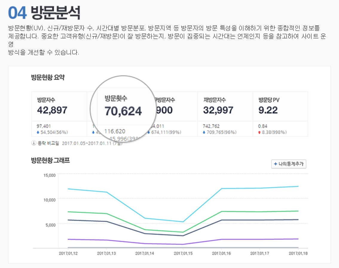 방문분석은 방문현황, 신규/재방문자 수, 시간대별 방문분포, 방문지역 등 방문자의 방문 특성을 이해하기 위한 종합적인 정보를 제공하고 중요한 고객유형 (신규/재방문)이 잘 방문하는지 방문이 집중되는 시간대는 언제인지 등을 참고하여 사이트 운영방식을 개선할 수 있다