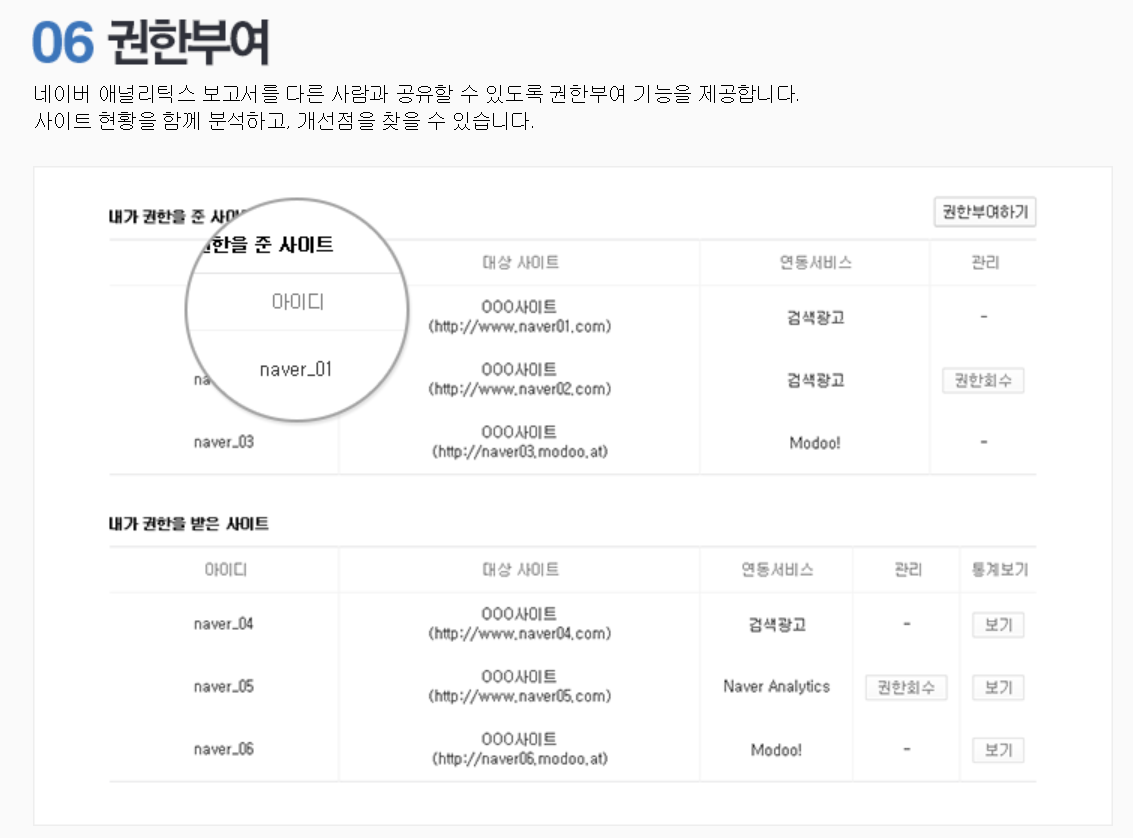 권한부여로 네이버 애널리틱스 보고서를 다른 사람과 공유할 수 있도록 권한부여 기능을 제공하고 사이트 현황을 함께 분석하고 개선점을 찾을 수 있다