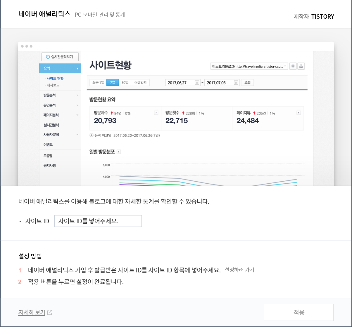 두개 모두 티스토리에 등록할 수 있지만 먼저 네이버 애널리틱스 설치하고 등록해봤어요