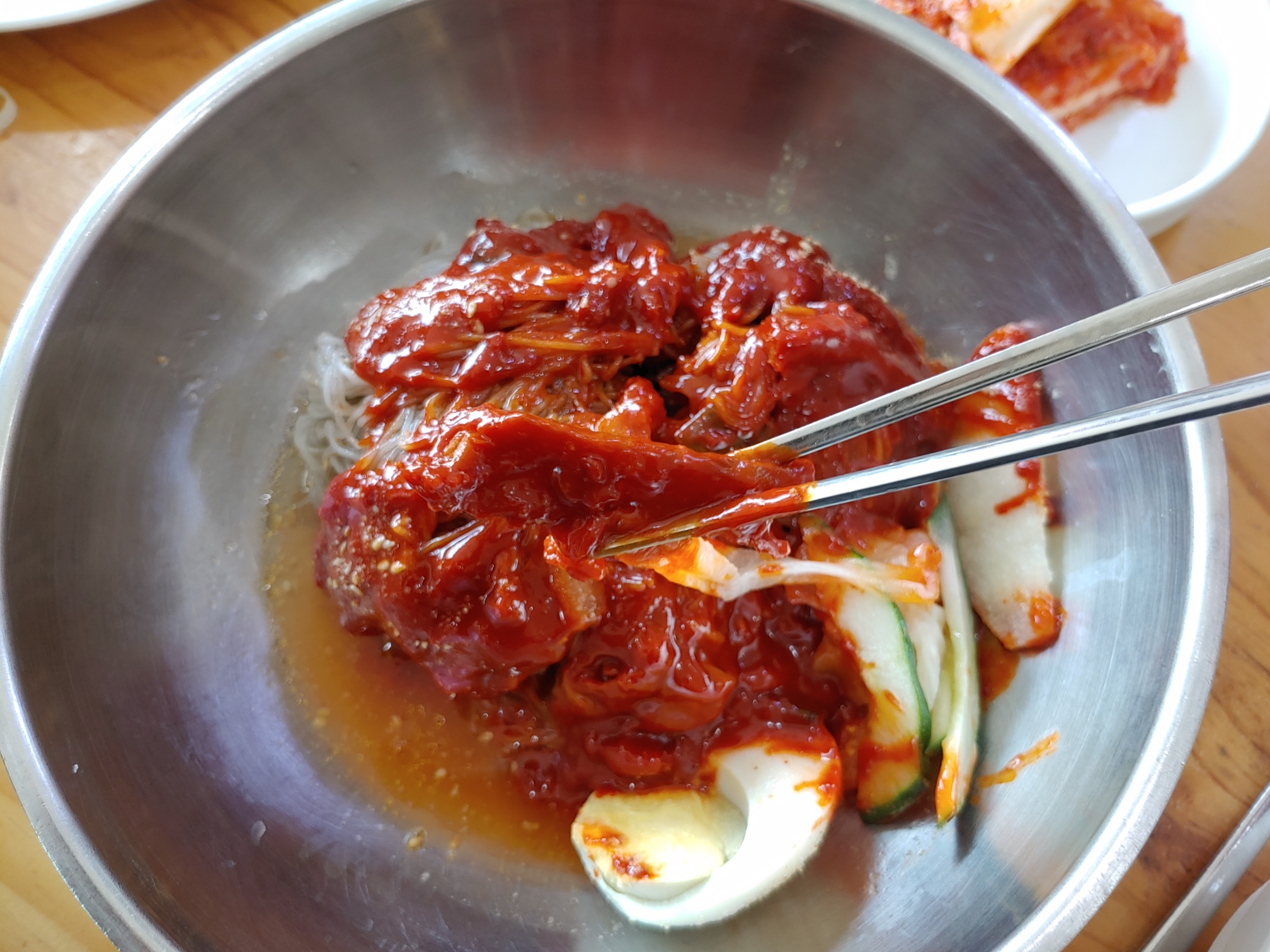 매콤한 황태소스양념이 맛있는 황태비빔냉면은 매콤하면서 달콤한데 매콤함이 더 강해요